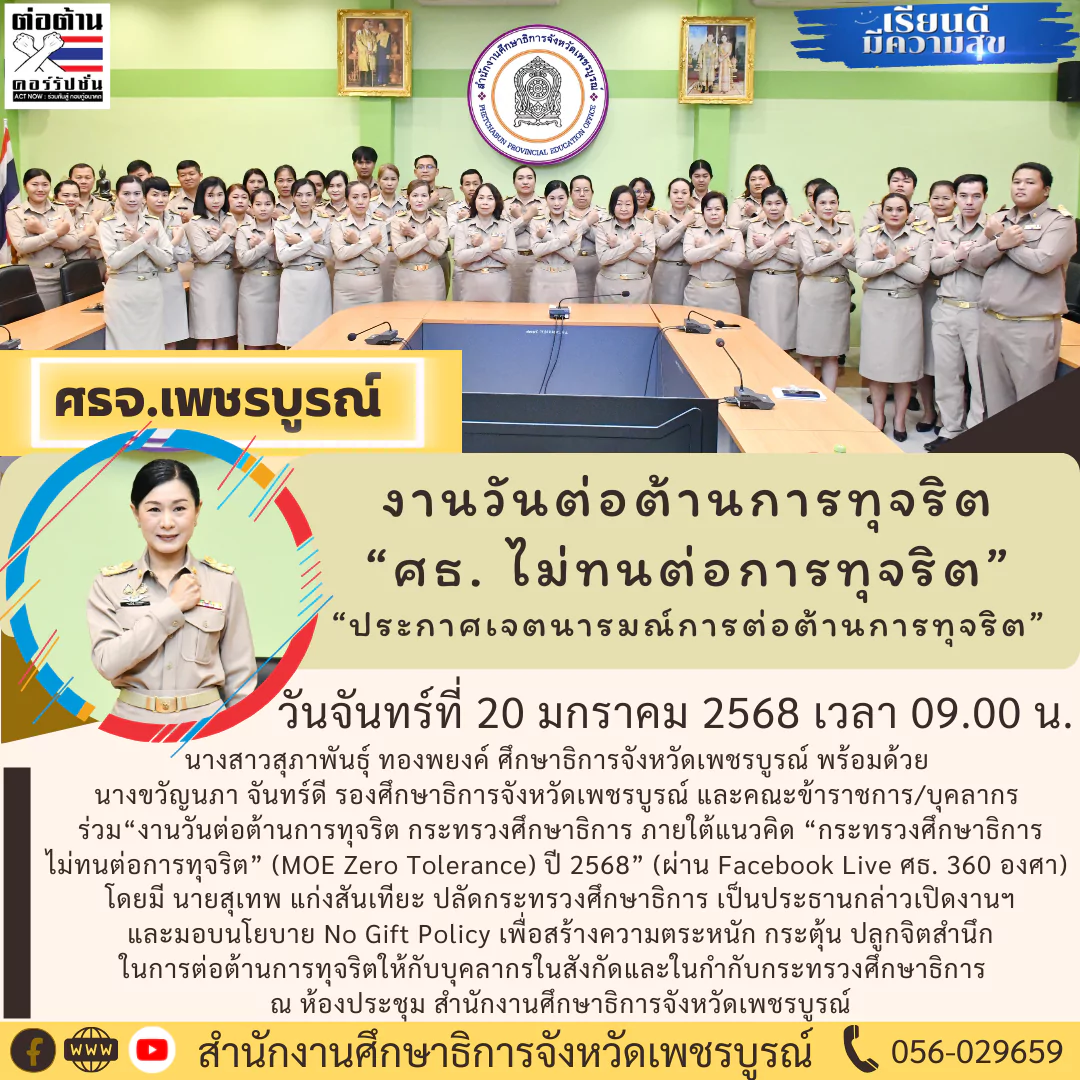 20 ม.ค. 68 (ศธจ.เพชรบูรณ์) ร่วม“งานวันต่อต้านการทุจริต กระทรวงศึกษาธิการ ภายใต้แนวคิด “กระทรวงศึกษาธิการไม่ทนต่อการทุจริต” (MOE Zero Tolerance) ประจำปี 2568”