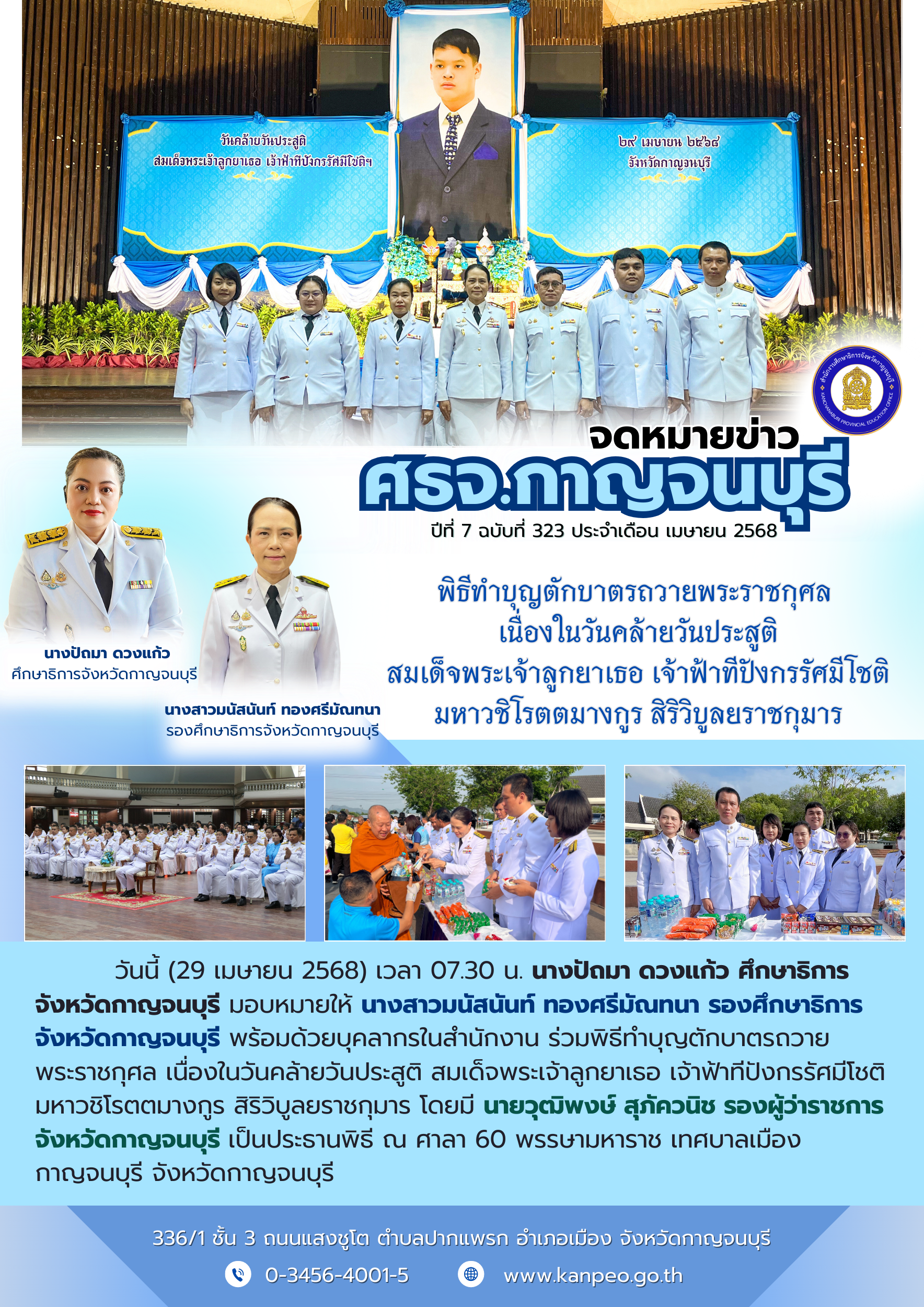 29 เม.ย. 68 (ศธจ.กาญจนบุรี) พิธีทำบุญตักบาตรถวายพระราชกุศลเนื่องในวันคล้ายวันประสูติ สมเด็จพระเจ้าลูกยาเธอ เจ้าฟ้าทีปังกรรัศมีโชติ มหาวชิโรตตมางกูร สิริวิบูลยราชกุมารี