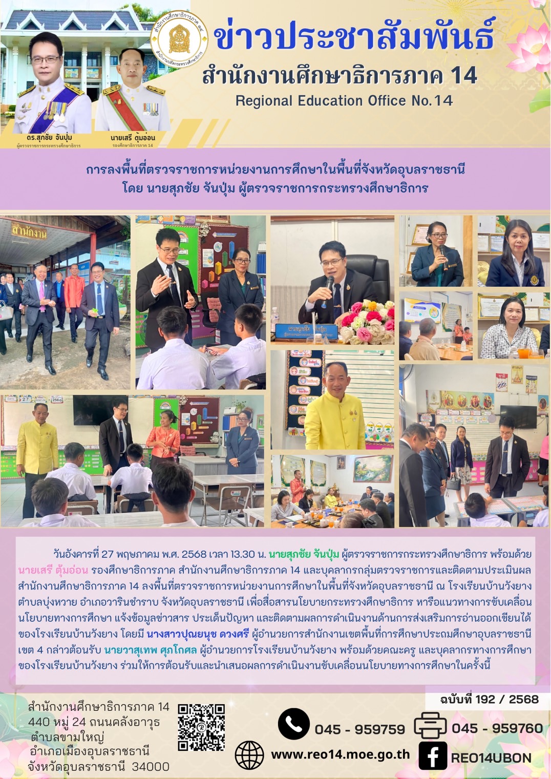 วันอังคารที่ 27 พฤษภาคม พ.ศ. 2568 เวลา 13.30 น. นายสุภชัย จันปุ่ม ผู้ตรวจราชการกระทรวงศึกษาธิการ พร้อมด้วย นายเสรี ตุ้มอ่อน รองศึกษาธิการภาค สำนักงานศึกษาธิการภาค 14 และบุคลากรกลุ่มตรวจราชการและติดตามประเมินผล สำนักงานศึกษาธิการภาค 14 ลงพื้นที่ตรวจราชการหน่วยงานการศึกษาในพื้นที่จังหวัดอุบลราชธานี ณ โรงเรียนบ้านวังยาง ตำบลบุ่งหวาย อำเภอวารินชำราบ จังหวัดอุบลราชธานี เพื่อสื่อสารนโยบายกระทรวงศึกษาธิการ หารือแนวทางการขับเคลื่อนนโยบายทางการศึกษา แจ้งข้อมูลข่าวสาร ประเด็นปัญหา และติดตามผลการดำเนินงานด้านการส่งเสริมการอ่านออกเขียนได้ของโรงเรียนบ้านวังยาง โดยมี นางสาวปุณยนุช ดวงศรี ผู้อำนวยการสำนักงานเขตพื้นที่การศึกษาประถมศึกษาอุบลราชธานี เขต 4 กล่าวต้อนรับ นายวาสุเทพ ศุภโกศล ผู้อำนวยการโรงเรียนบ้านวังยาง พร้อมด้วยคณะครู และบุคลากรทางการศึกษา ของโรงเรียนบ้านวังยาง ร่วมให้การต้อนรับและนำเสนอผลการดำเนินงานขับเคลื่อนนโยบายทางการศึกษาในครั้งนี้