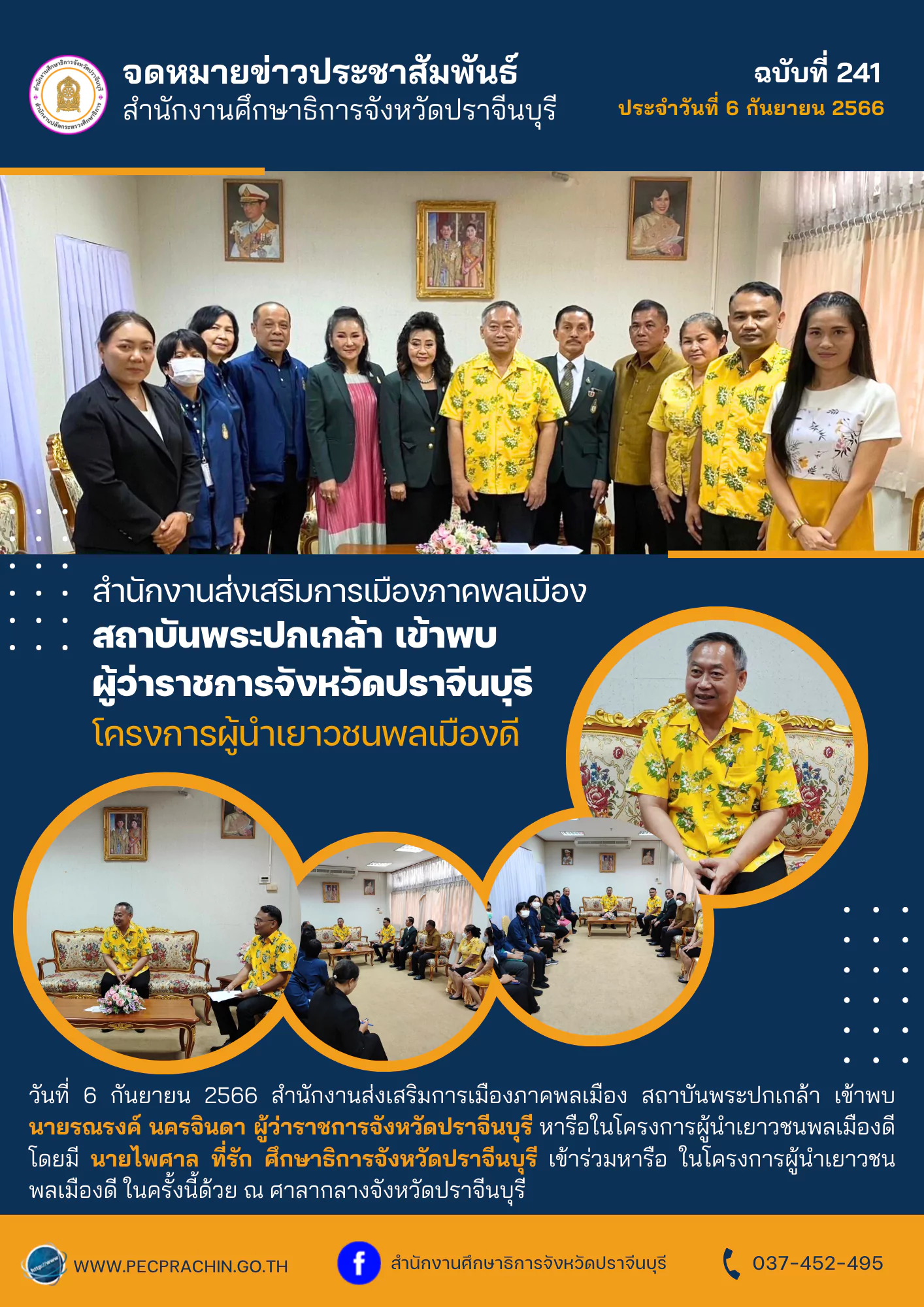 06 ก.ย. 66 [ศธจ.ปราจีนบุรี] สำนักงานส่งเสริมการเมืองภาคพลเมือง สถาบันพระปกเกล้า และศึกษาธิการจังหวัดปราจีนบุรี เข้าพบ ผู้ว่าราชการจังหวัดปราจีนบุรี หารือในโครงการผู้นำเยาวชนพลเมืองดี