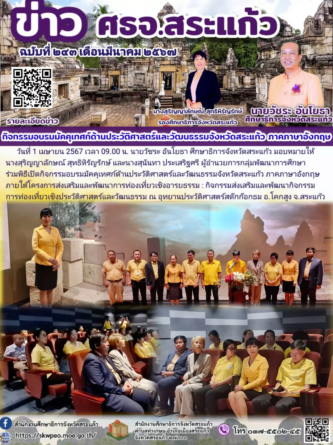 01 เม.ย. 67 (ศธจ.สระแก้ว) ร่วมพิธีเปิดกิจกรรมอบรมมัคคุเทศก์ด้านประวัติศาสตร์และวัฒนธรรมจังหวัดสระแก้ว