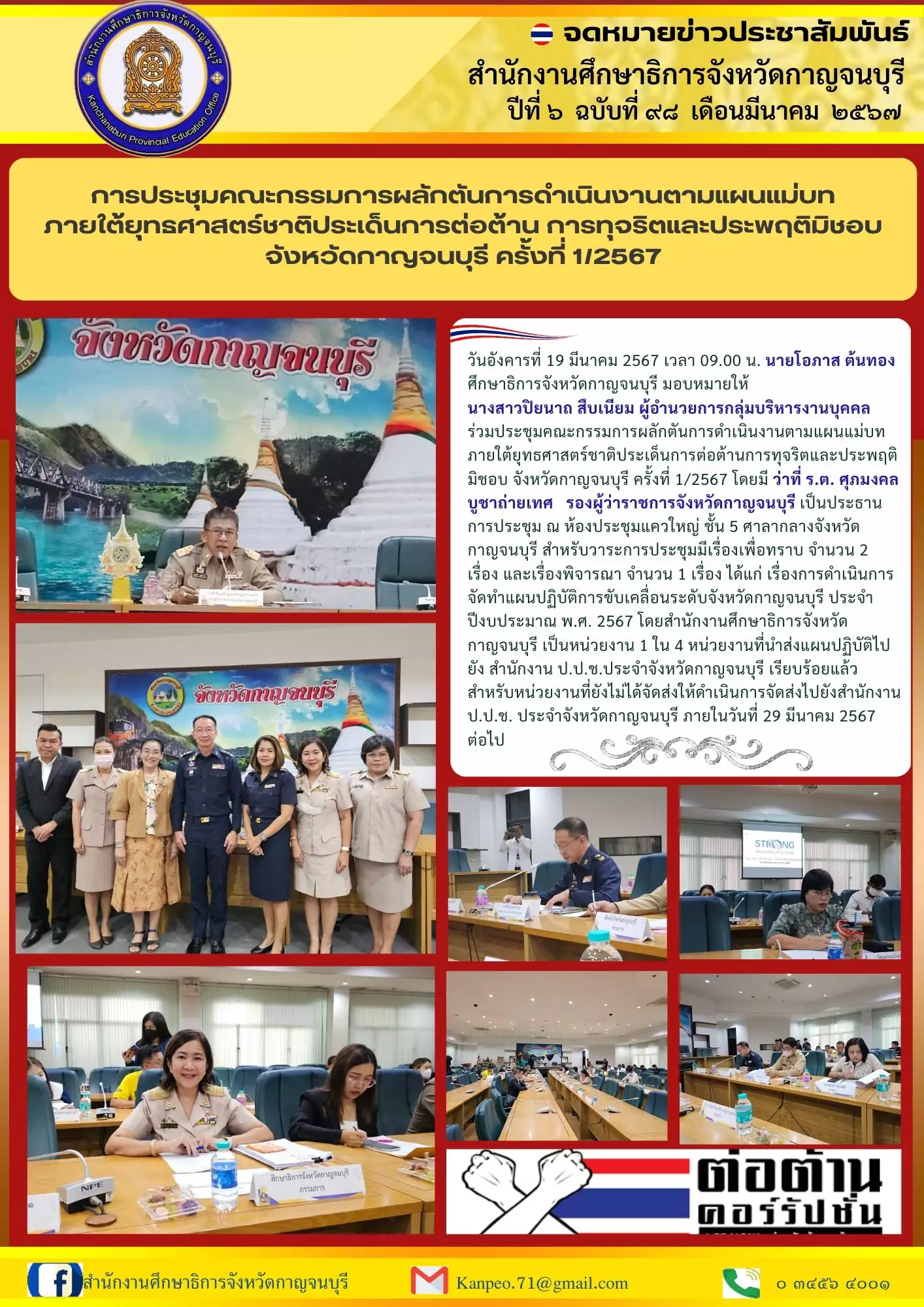 ประชุมเชิงปฏิบัติการสรุปผลการตรวจราชการ และติดตามการประเมินผลการจัดการศึกษาของกระทรวงศึกษาธิการ ประจำปีงบประมาณ 2562 เขตตรวจราชการที่ 3 โดยมี คณะศึกษานิเทศก์ จากสำนักงานศึกษาธิการจังหวัดราชบุรี สำนักงานศึกษาธิการจังหวัดกาญจนบุรี สำนักงานศึกษาธิการจังหวัดสุพรรณบุรี ระหว่างวันที่ 19-20 สิงหาคม 2562 ณ ห้องประชุมทองกวาว โรงแรมเวสเทิร์นแกรนด์ราชบุรี อำเภอเมืองราชบุรี จังหวัดราชบุรี
