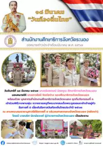 วันจันทร์ที่ ๑๘ มีนาคม ๒๕๖๗ นางณันศภรณ์ นิลอรุณ ศึกษาธิการจังหวัดระนอง มอบหมายให้ นางสาวรัชนี จิตต์สว่าง รองศึกษาธิการจังหวัดระนอง พร้อมด้วย บุคลากรสำนักงานศึกษาธิการจังหวัดระนอง ชุดทีมกิจกรรมที่ ๓ เข้าร่วมพิธีวางพานพุ่ม ถวายราชสดุดีพระบาทสมเด็จพระจุลจอมเกล้าเจ้าอยู่หัว รัชกาลที่ ๕ เนื่องในโอกาสวันท้องถิ่นไทยประจำปี ๒๕๖๗ ณ ลานพระบรมราชานุสาวรีย์รัชกาลที่ ๕ บริเวณศาลากลางจังหวัดระนอง (หลังเก่า) โดยมี นายนริศ นิรามัยวงศ์ ผู้ว่าราชการจังหวัดระนอง เป็นประธาน