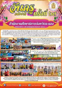 วันพฤหัสบดีที่ ๑๖ มกราคม พ.ศ. ๒๕๖๘ สำนักงานศึกษาธิการจังหวัดระนอง จัดงานวันครู ครั้งที่ ๖๙ พ.ศ. ๒๕๖๘ มีข้าราชการครูและบุคลากรทางการศึกษา จากสถานศึกษา สังกัดสำนักงานศึกษาธิการจังหวัดระนอง สำนักงานเขตพื้นที่การศึกษาประถมศึกษาระนอง สำนักงานเขตพื้นที่การศึกษามัธยมศึกษาพังงา ภูเก็ต ระนอง (ในเขตพื้นที่จังหวัดระนอง) สำนักงานคณะกรรมการส่งเสริมการศึกษาเอกชน สำนักงานคณะกรรมการการอาชีวศึกษา กรมส่งเสริมการปกครองท้องถิ่น สำนักงานส่งเสริมการเรียนรู้ประจำจังหวัดระนอง วิทยาลัยชุมชนระนอง สำนักบริหารงานการศึกษาพิเศษ ตลอดจนสถานศึกษาทั้งภาครัฐและเอกชนทุกภาคส่วนในจังหวัดระนอง ประมาณ ๑,๐๐๐ คน ซึ่งการจัดงานวันครูครั้งนี้มีการจัดกิจกรรมแบ่งเป็น ๓ ช่วง