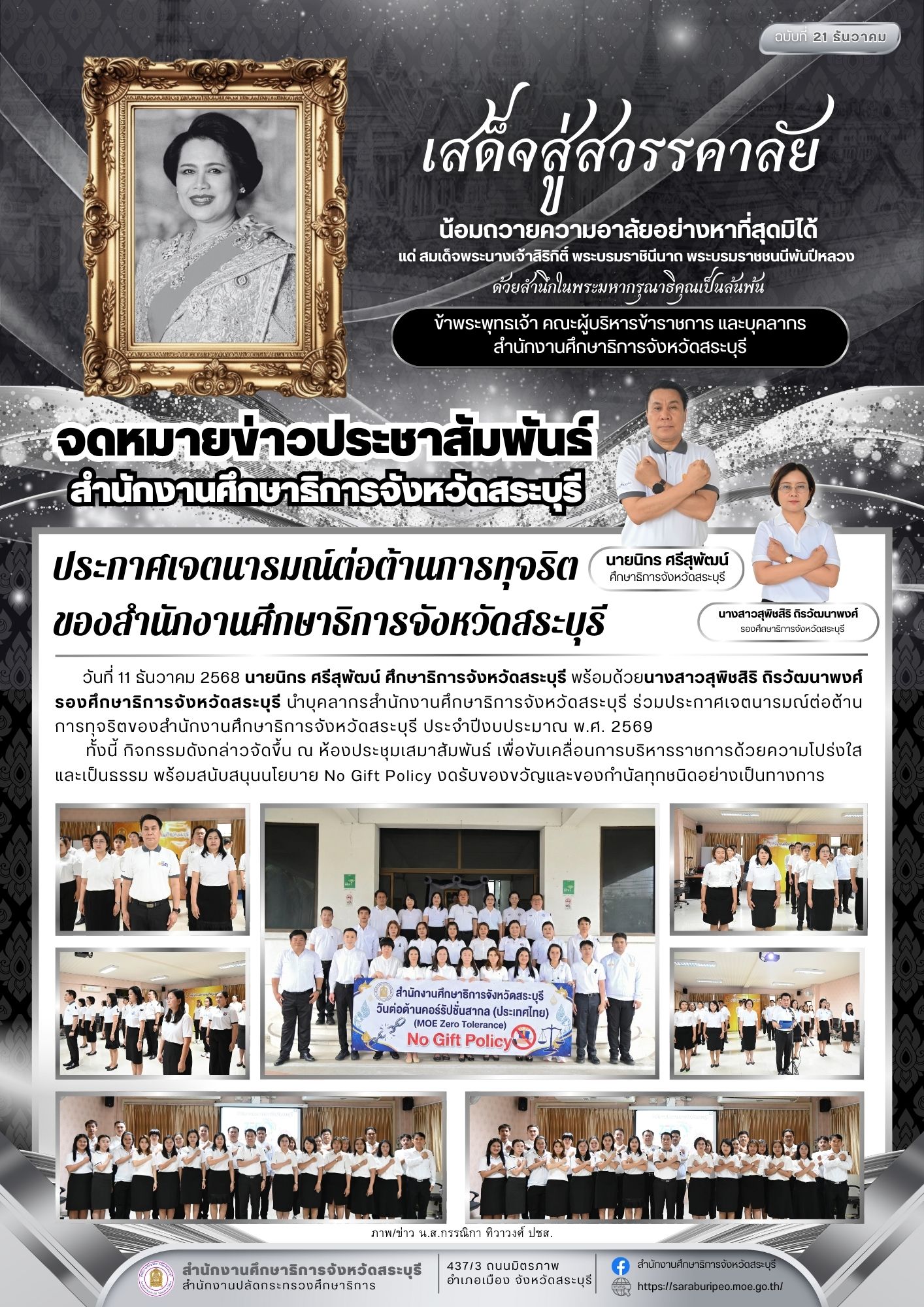วันอังคารที่ ๙ ธันวาคม ๒๕๖๘ เวลา o๙.๓๐ น. นายนิยม ไผ่โสภา ผู้ตรวจราชการกระทรวงศึกษาธิการ ปฏิบัติหน้าที่ศึกษาธิการภาค สำนักงานศึกษาธิการภาค ๑๖ มอบหมายบุคลากรสำนักงานศึกษาธิการภาค ๑๖ จัดกิจกรรมรณรงค์ต่อต้านการทุจริต การแสดงสัญลักษณ์ต่อต้านการทุจริต (No Gift Policy) และเข้าร่วมงานผ่าน Facebook Live Fanpage ศธ.360 องศา ถ่ายทอดสัญญาณจาก หอประชุมคุรุสภา กระทรวงศึกษาธิการ โดยมีนายสุเทพ แก่งสันเทียะ ปลัดกระทรวงศึกษาธิการ เป็นประธาน