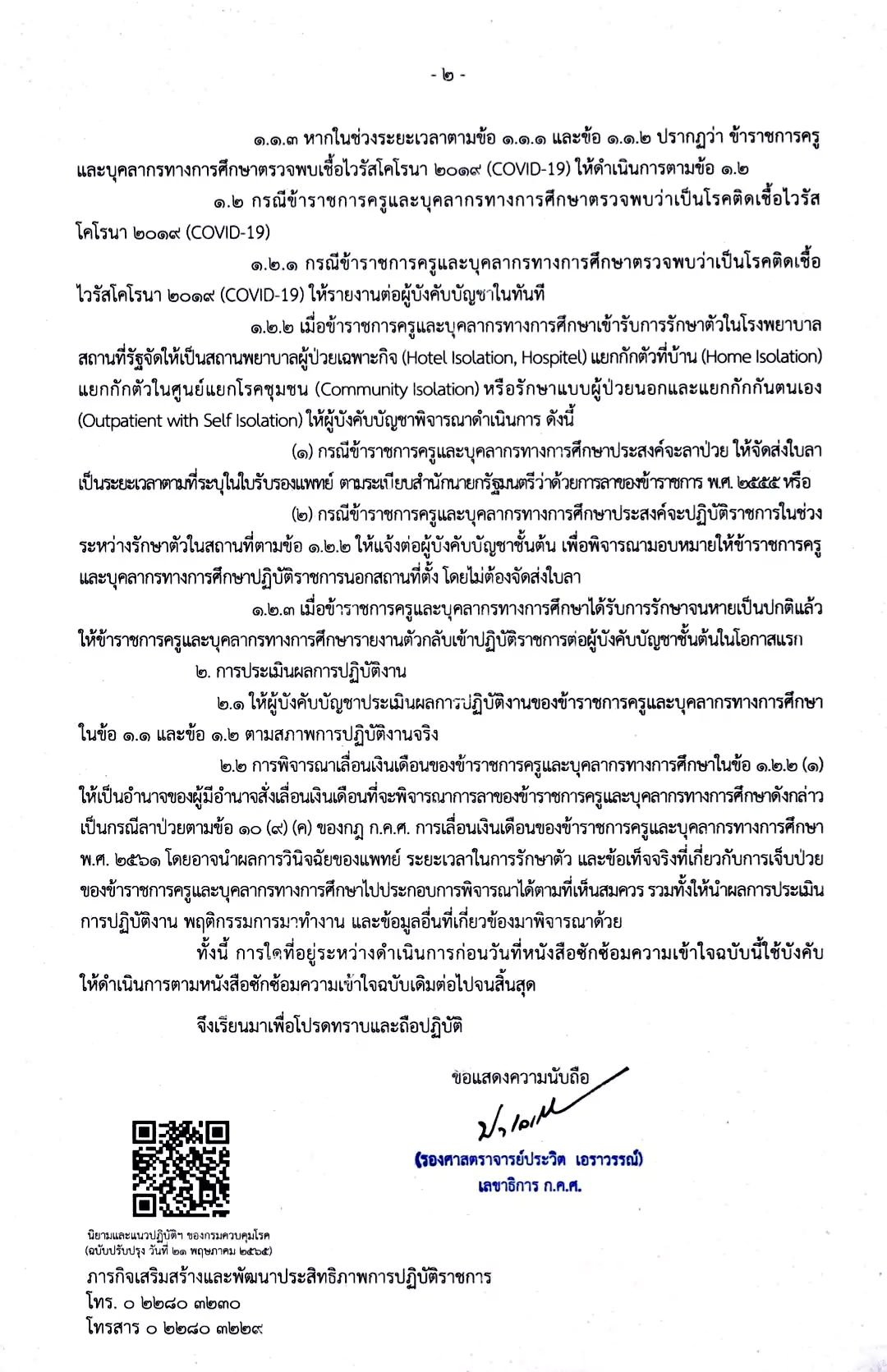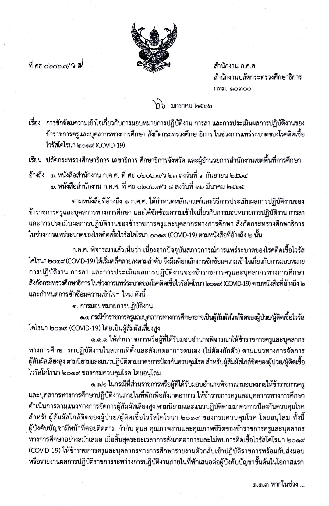 สำนักงาน ก.ค.ศ. ออกหนังสือเวียน (ว7/2566) เรื่อง การซักซ้อมความเข้าใจเกี่ยวกับการมอบหมายการปฏิบัติงาน การลา และการประเมินผลการปฏิบัติงานของข้าราชการครูและบุคลากรทางการศึกษา สังกัดกระทรวงศึกษาธิการ ในช่วงการแพร่ระบาดของโรคติดเชื้อไวรัสโคโรนา 2019 (COVID-19) เนื่องจากสภาวการณ์การแพร่ระบาดได้เริ่มคลี่คลายลงตามลำดับ