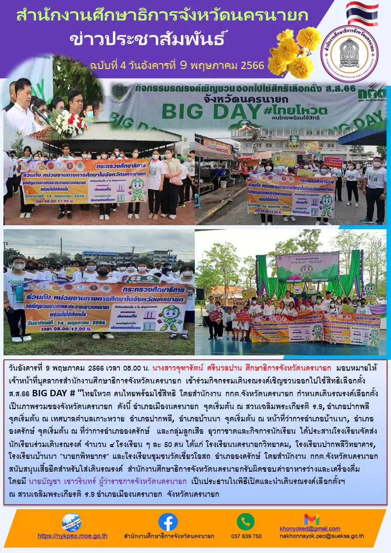 09 พ.ค. 66 ศธจ.นครนายก เข้าร่วมกิจกรรมเดินรณรงค์เชิญชวนออกไปใช้สิทธิเลือกตั้ง ส.ส.66 BIG DAY # “ไทยโหวต คนไทยพร้อมใช้สิทธิ โดยสำนักงาน กกต.จังหวัดนครนายก กำหนดเดินรณรงค์เลือกตั้งฯ เป็นภาพรวมของจังหวัดนครนายก