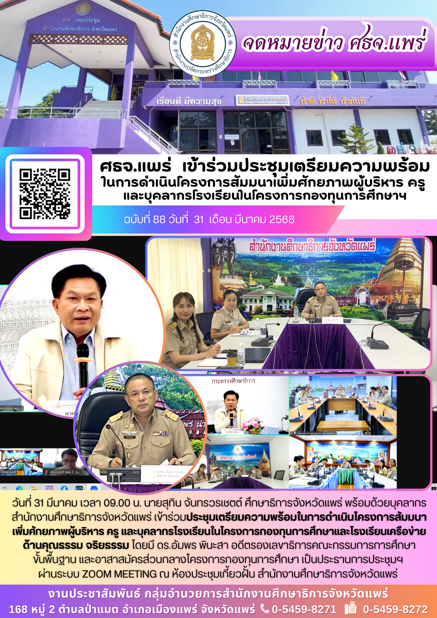 02 เม.ย. 68 ศธจ.แพร่ เข้าร่วมประชุมเตรียมความพร้อมในการดำเนินโครงการสัมมนาเพิ่มศักยภาพผู้บริหาร ครู และบุคลากรโรงเรียนในโครงการกองทุนการศึกษาฯ