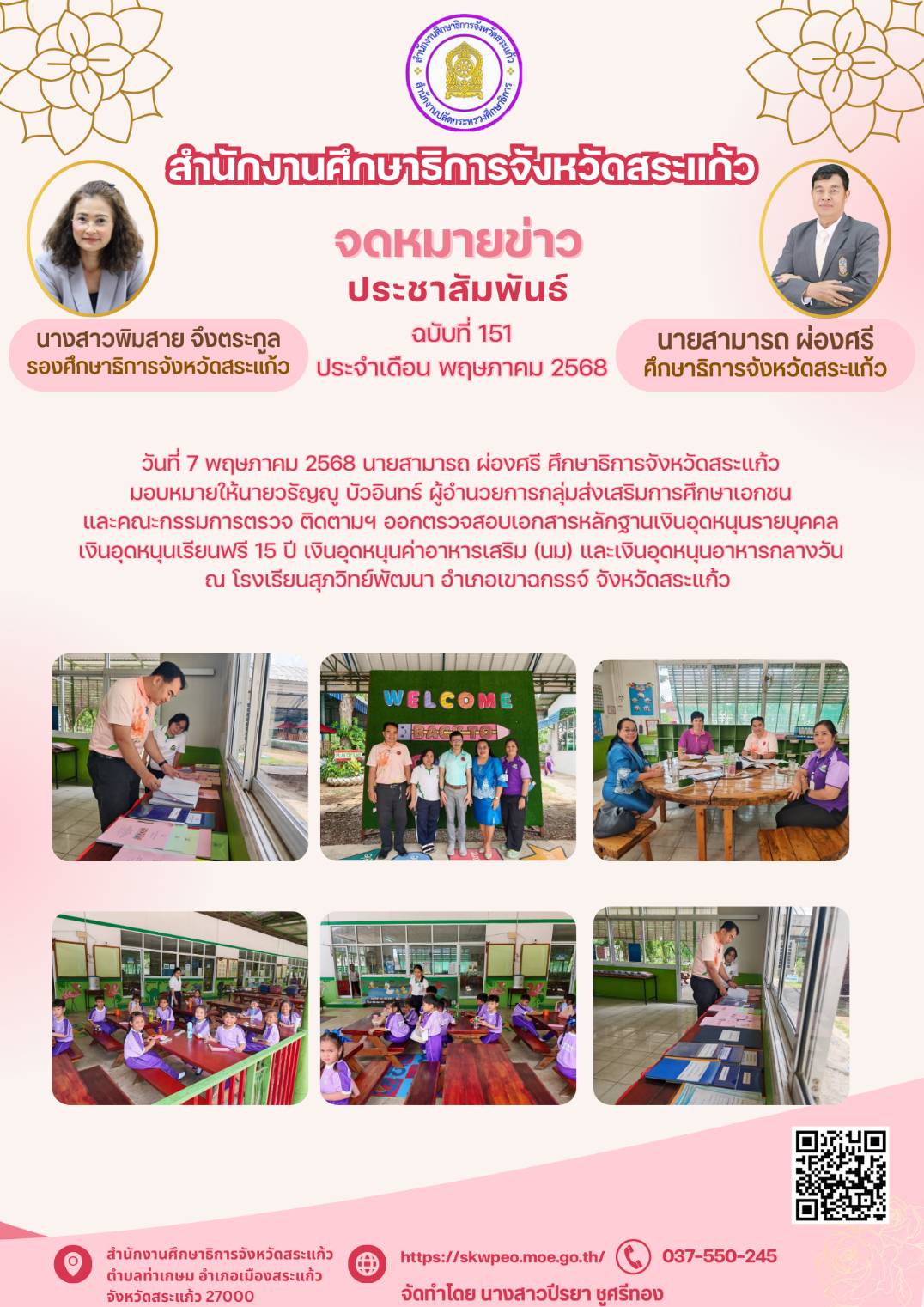 07 พ.ค. 68 (ศธจ.สระแก้ว) ติดตามและกำกับการใช้เงินอุดหนุนโรงเรียนเอกชนในระบบ ปีการศึกษา 2566 ณ โรงเรียนสุภวิทย์พัฒนา