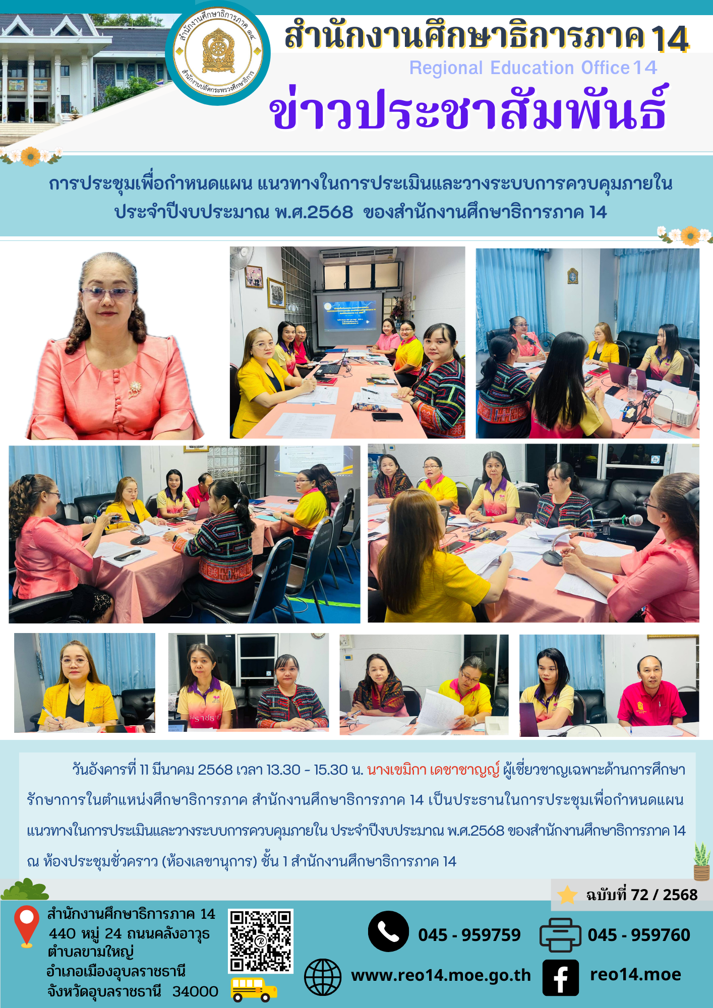 12 มี.ค. 68 การประชุมเพื่อกำหนดแผน แนวทางในการประเมินและวางระบบการควบคุมภายใน ประจำปีงบประมาณ พ.ศ.2568 ของสำนักงานศึกษาธิการภาค 14