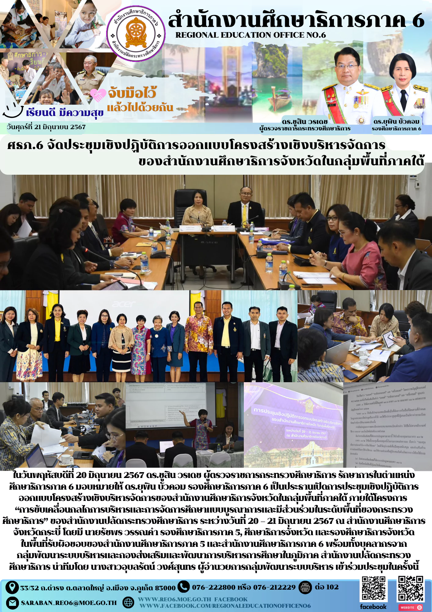 21 มิ.ย. 67 ศธภ.6 จัดประชุมเชิงปฏิบัติการออกแบบโครงสร้างเชิงบริหารจัดการของสำนักงานศึกษาธิการจังหวัดในกลุ่มพื้นที่ภาคใต้