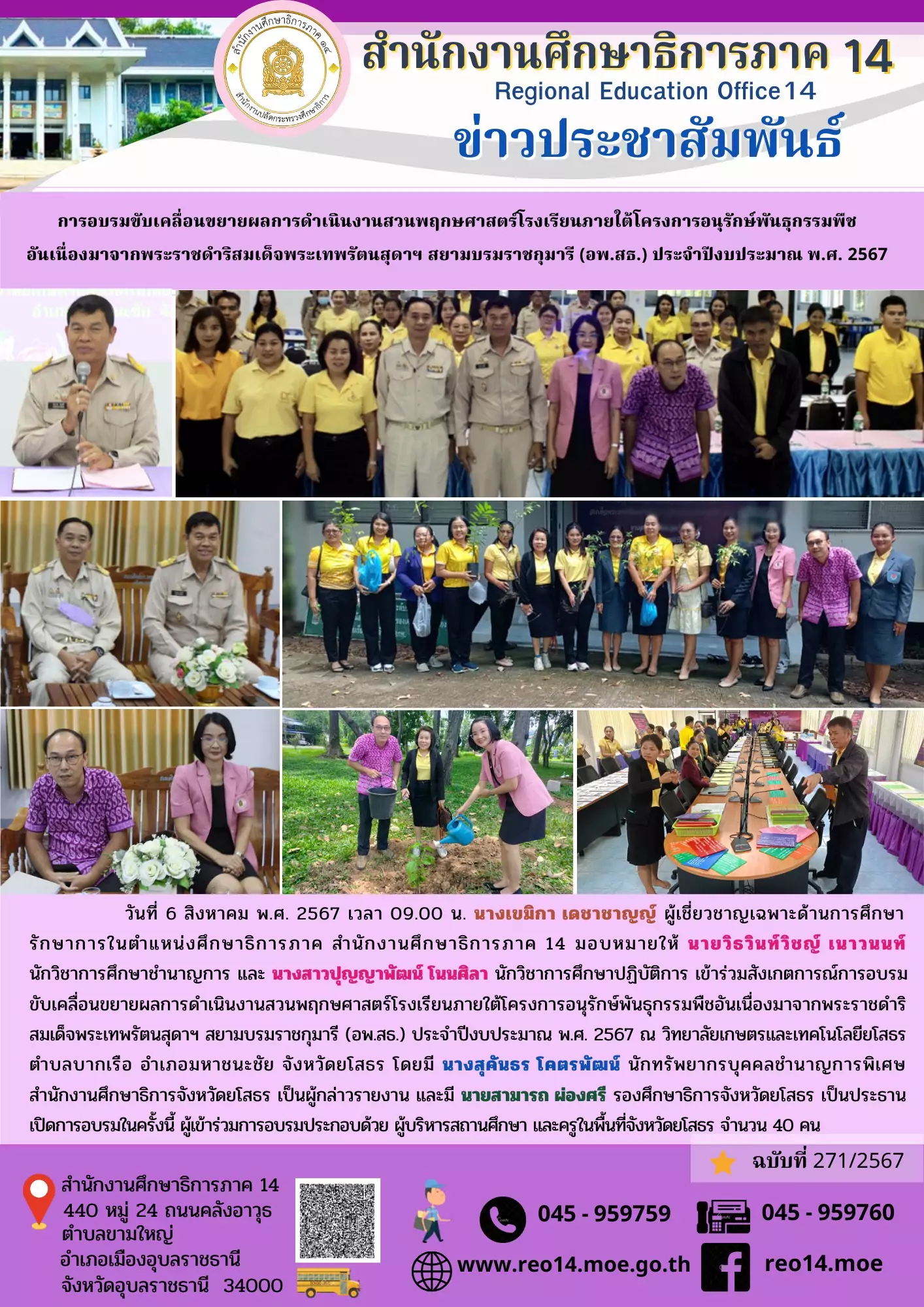 06 ส.ค. 67 ศธภ.14 ร่วมการอบรมขับเคลื่อนขยายผลการดำเนินงานสวนพฤกษศาสตร์โรงเรียนภายใต้โครงการอนุรักษ์พันธุกรรมพืช อันเนื่องมาจากพระราชดำริสมเด็จพระเทพรัตนสุดาฯ สยามบรมราชกุมารี (อพ.สธ.) ประจำปีงบประมาณ พ.ศ. 2567