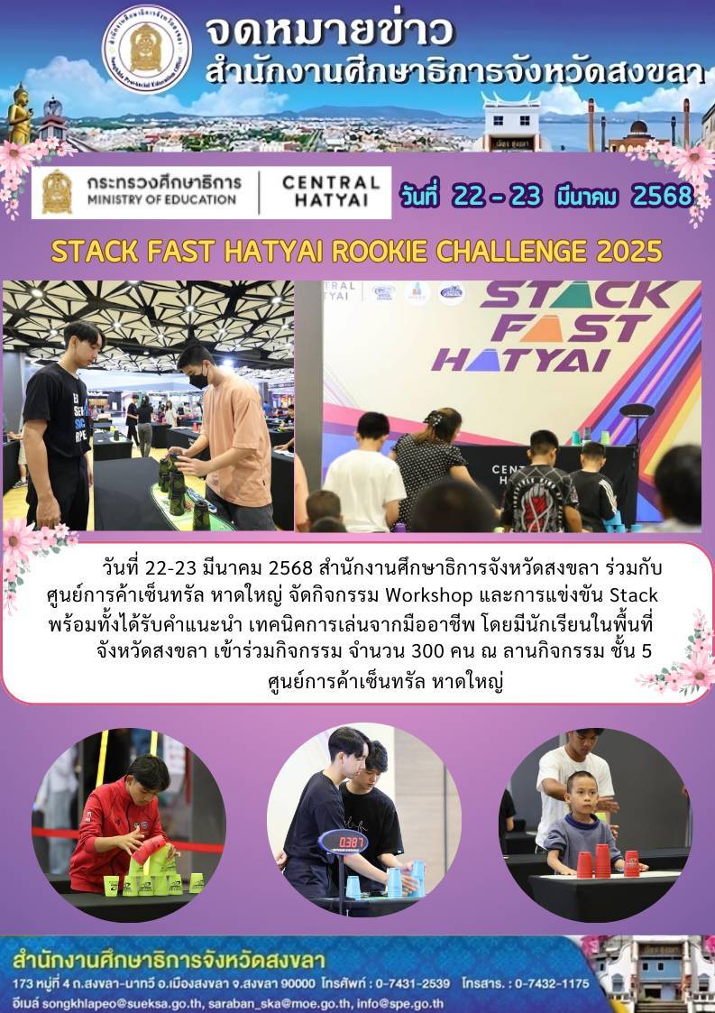 วันที่ 22-23 มีนาคม 2568 สำนักงานศึกษาธิการจังหวัดสงขลา ร่วมกับ ศูนย์การค้าเซ็นทรัล หาดใหญ่ จัดกิจกรรม Workshop และการแข่งขัน Stack พร้อมทั้งได้รับคำแนะนำ เทคนิคการเล่นจากมืออาชีพ โดยมีนักเรียนในพื้นที่จังหวัดสงขลา เข้าร่วมกิจกรรม จำนวน 300 คน ณ ลานกิจกรรม ชั้น 5 ศูนย์การค้าเซ็นทรัล หาดใหญ่