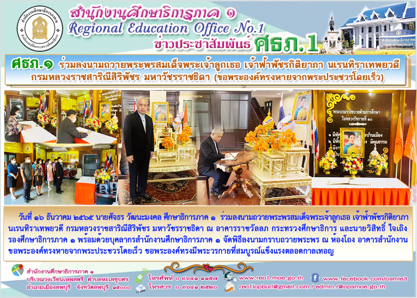 16 ธ.ค. 65 ศธภ.๑ ร่วมลงนามถวายพระพรสมเด็จพระเจ้าลูกเธอ เจ้าฟ้าพัชรกิติยาภา นเรนทิราเทพยวดี กรมหลวงราชสาริณีสิริพัชร มหาวัชรราชธิดา (ขอพระองค์ทรงหายจากพระประชวรโดยเร็ว)