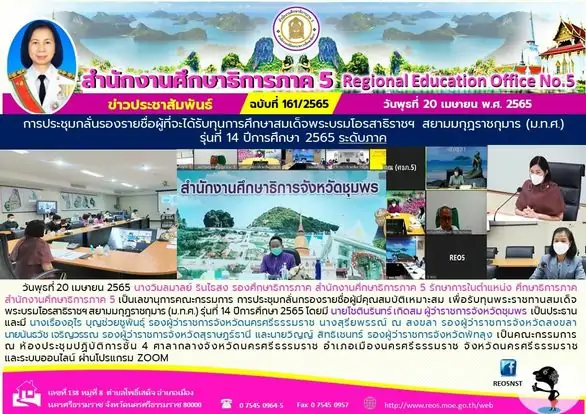 03 พ.ค. 65 สำนักงานศึกษาธิการภาค 5 จัดประชุมกลั่นกรองรายชื่อผู้มีคุณสมบัติเหมาะสม เพื่อรับทุนพระราชทานสมเด็จพระบรมโอรสาธิราชฯ สยามมกุฎราชกุมาร (ม.ท.ศ.) รุ่นที่ 14 ปีการศึกษา 2565