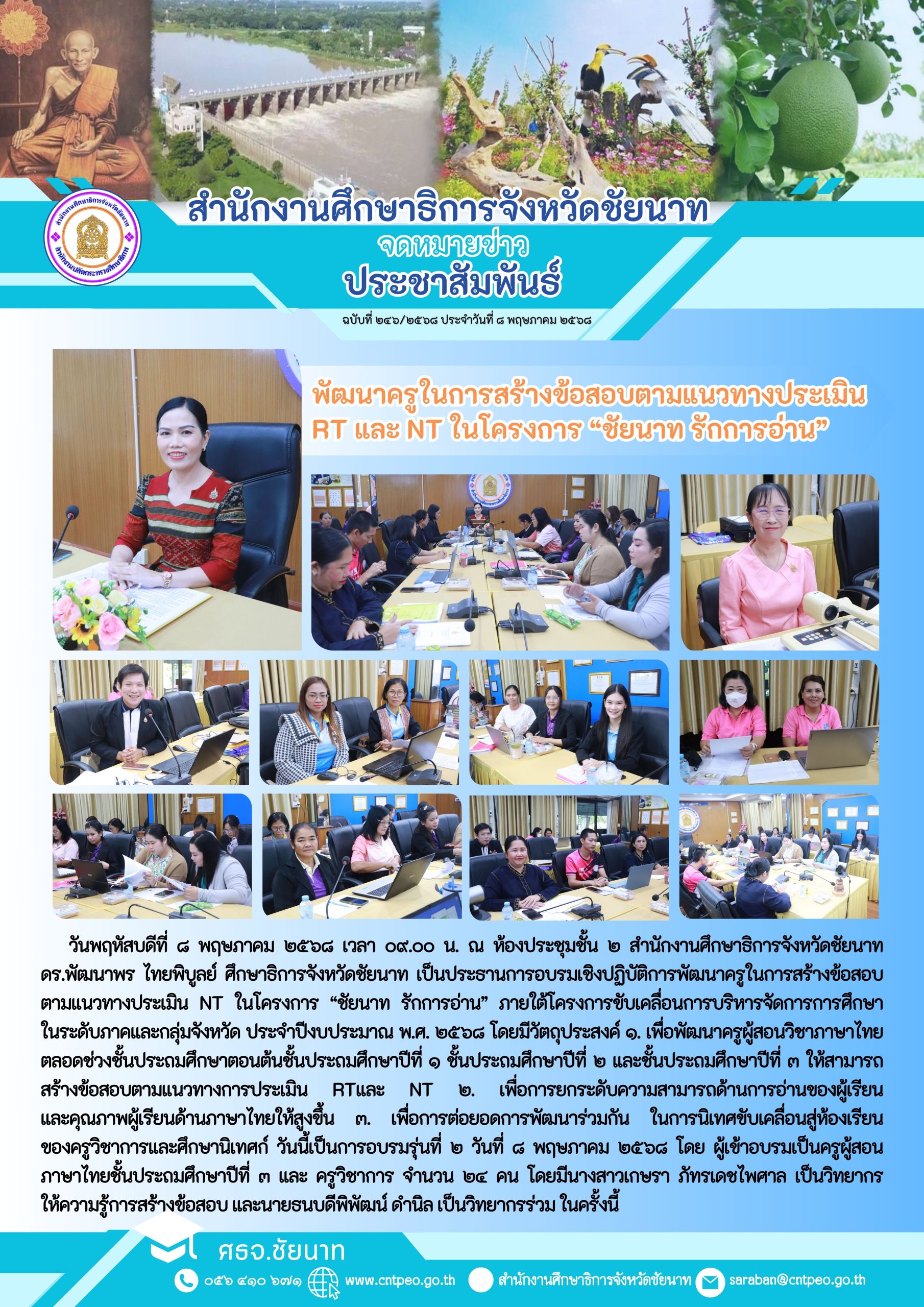 08 พ.ค. 68 (ศธจ.ชัยนาท) อบรมเชิงปฏิบัติการพัฒนาครูในการสร้างข้อสอบตามแนวทางประเมิน NT ในโครงการ “ชัยนาท รักการอ่าน”