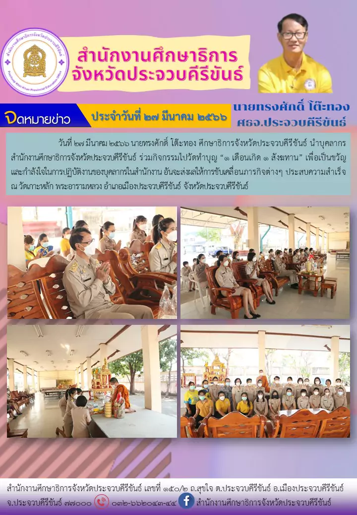 27 มี.ค. 66 กิจกรรมไปวัดทำบุญ “1 เดือนเกิด 1 สังฆทาน” เพื่อเป็นขวัญและกำลังใจในการปฏิบัติงานของบุคลากรในสำนักงาน