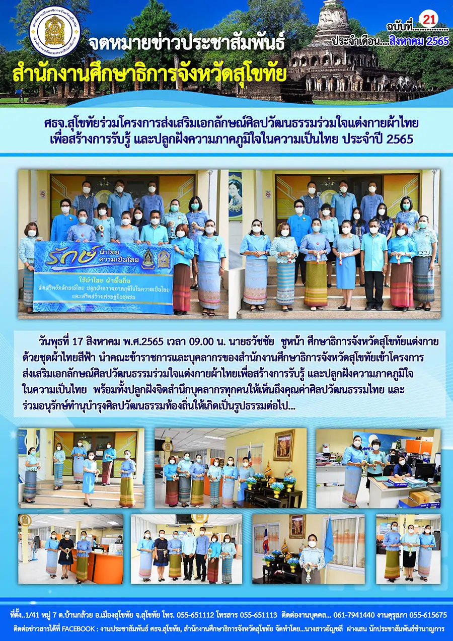 วันพุธที่ 17 สิงหาคม พ.ศ.2565 เวลา 09.00 น. นายธวัชชัย ชูหน้า ศึกษาธิการจังหวัดสุโขทัยแต่งกายด้วยชุดผ้าไทยสีฟ้า นำคณะข้าราชการและบุคลากรของสำนักงานศึกษาธิการจังหวัดสุโขทัยเข้าโครงการส่งเสริมเอกลักษณ์ศิลปวัฒนธรรมร่วมใจแต่งกายผ้าไทยเพื่อสร้างการรับรู้ และปลูกฝังความภาคภูมิใจในความเป็นไทย พร้อมทั้งปลูกฝังจิตสำนึกบุคลากรทุกคนให้เห็นถึงคุณค่าศิลปวัฒนธรรมไทย และร่วมอนุรักษ์ทำนุบำรุงศิลปวัฒนธรรมท้องถิ่นให้เกิดเป็นรูปธรรมต่อไป…