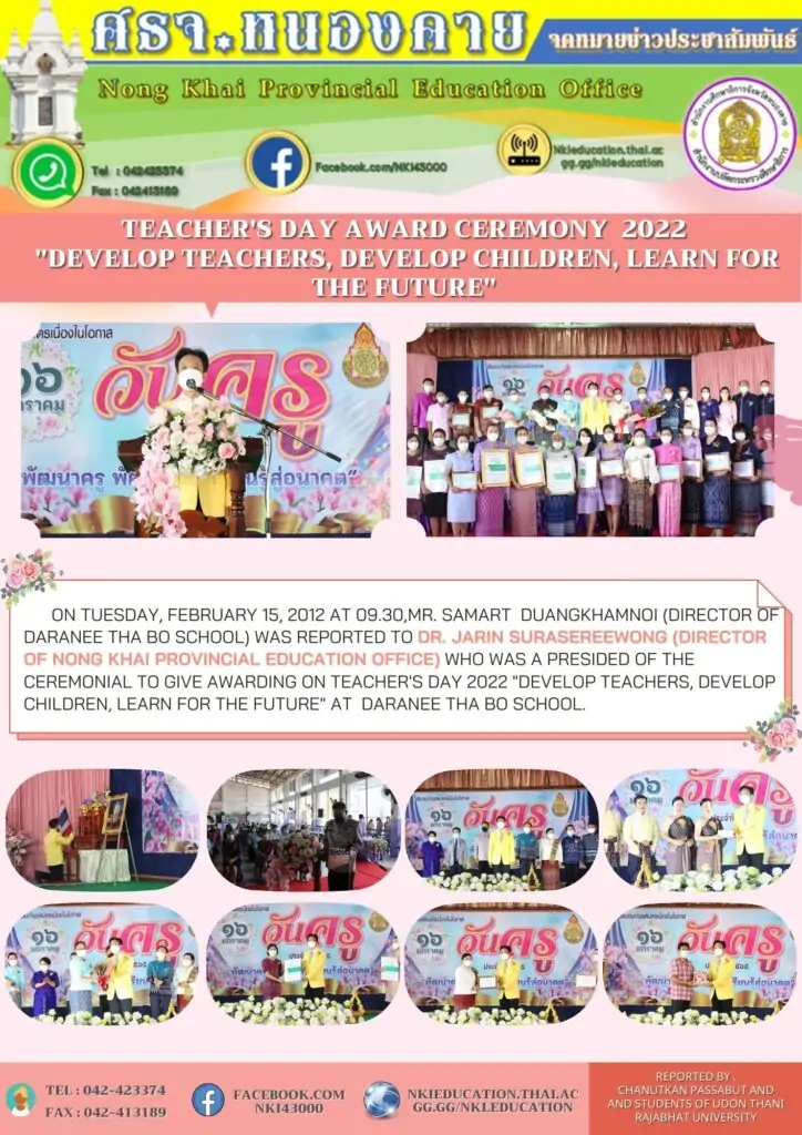 On Tuesday, February 15, 2012 at 09.30,Mr. Samart  Duangkhamnoi (Director of Daranee Tha Bo School) was reported to Dr. Jarin Surasereewong (Director of Nong Khai Provincial Education Office) who was a presided of the ceremonial to give awarding on Teacher’s Day 2022 “Develop Teachers, Develop Children, Learn for the Future” at  Daranee Tha Bo School.