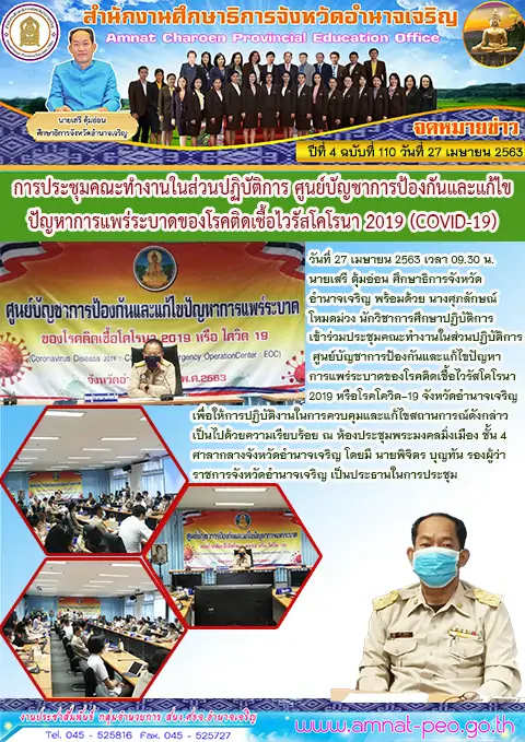 วันที่ 27 เมษายน 2563 เวลา 09.30 น. นายเสรี ตุ้มอ่อน ศึกษาธิการจังหวัดอำนาจเจริญ พร้อมด้วย นางศุภลักษณ์ โหมดม่วง นักวิชาการศึกษาปฏิบัติการ เข้าร่วมประชุมคณะทำงานในส่วนปฏิบัติการ ศูนย์บัญชาการป้องกันและแก้ไขปัญหาการแพร่ระบาดของโรคติดเชื้อไวรัสโคโรนา 2019 หรือโรคโควิด-19 จังหวัดอำนาจเจริญ เพื่อให้การปฏิบัติงานในการควบคุมและแก้ไขสถานการณ์ดังกล่าวเป็นไปด้วยความเรียบร้อย ณ ห้องประชุมพระมงคลมิ่งเมือง ชั้น 4 ศาลากลางจังหวัดอำนาจเจริญ โดยมี นายพิจิตร บุญทัน รองผู้ว่าราชการจังหวัดอำนาจเจริญ เป็นประธานในการประชุม