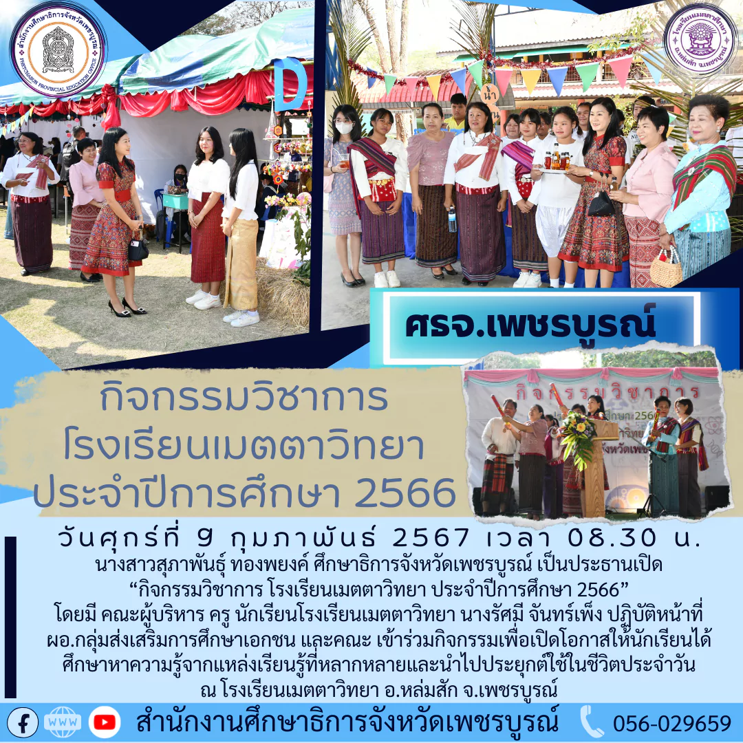 วันศุกร์ที่ 9 กุมภาพันธ์ 2567 เวลา 08.30 น. นางสาวสุภาพันธุ์ ทองพยงค์ ศึกษาธิการจังหวัดเพชรบูรณ์ เป็นประธานเปิด“กิจกรรมวิชาการ โรงเรียนเมตตาวิทยา ประจำปีการศึกษา 2566” โดยมี คณะผู้บริหาร ครู นักเรียนโรงเรียนเมตตาวิทยา นางรัศมี จันทร์เพ็ง ปฏิบัติหน้าที่ ผอ.กลุ่มส่งเสริมการศึกษาเอกชน และคณะ เข้าร่วมกิจกรรม การจัดกิจกรรมวิชาการมีวัตถุประสงค์เพื่อเปิดโอกาสให้นักเรียนได้ศึกษาหาความรู้จากแหล่งเรียนรู้ที่หลากหลายและนำไปประยุกต์ใช้ในชีวิตประจำวันได้อย่างมีประสิทธิภาพ ณ โรงเรียนเมตตาวิทยา อ.หล่มสัก จ.เพชรบูรณ์