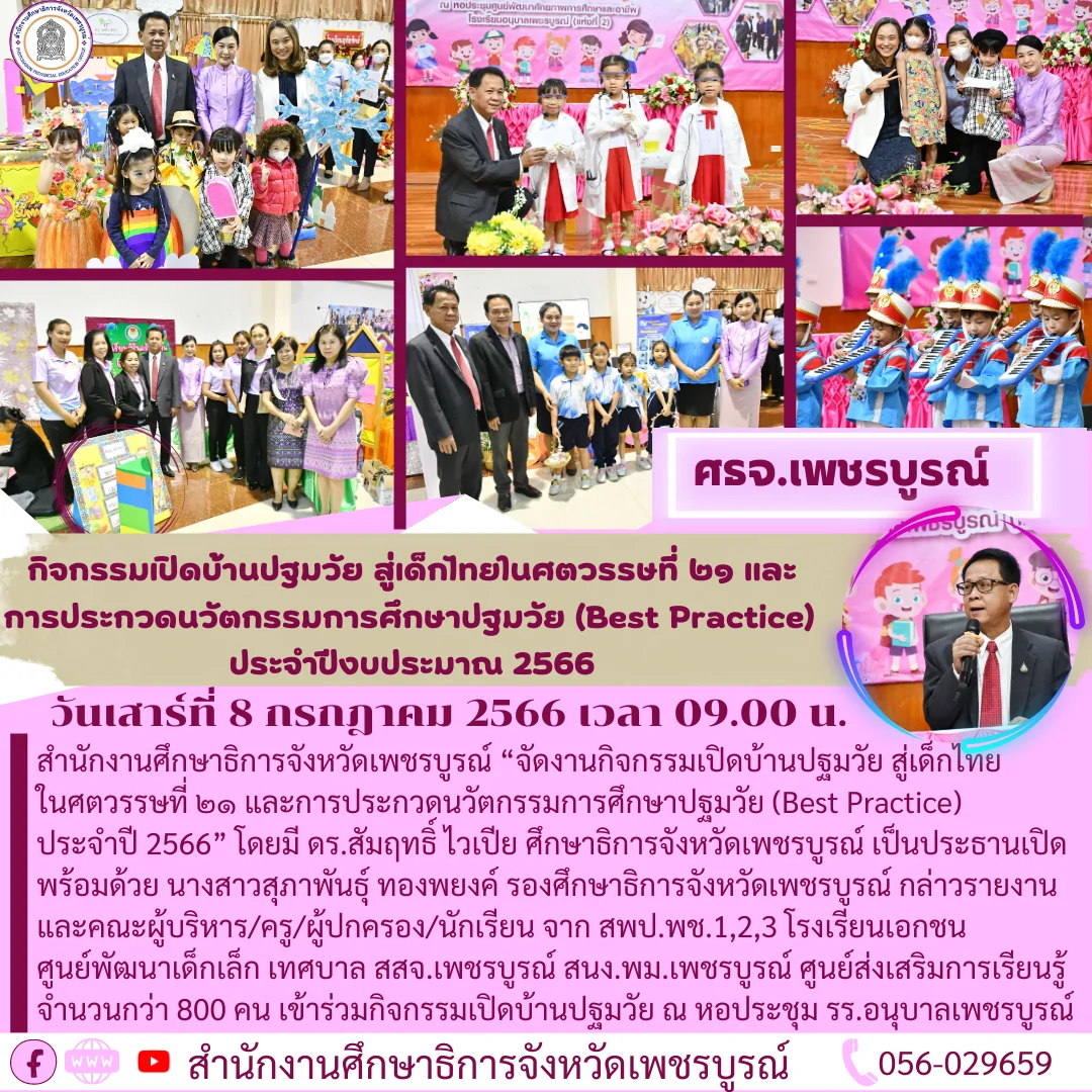 วันเสาร์ที่ 8 กรกฎาคม 2566 เวลา 09.00 น. สำนักงานศึกษาธิการจังหวัดเพชรบูรณ์ “จัดงานกิจกรรมเปิดบ้านปฐมวัย สู่เด็กไทยในศตวรรษที่ ๒๑ และการประกวดนวัตกรรมการศึกษาปฐมวัย (Best Practice) ประจำปี 2566” โดยมี ดร.สัมฤทธิ์ ไวเปีย ศึกษาธิการจังหวัดเพชรบูรณ์ เป็นประธานเปิดงาน พร้อมด้วย นางสาวสุภาพันธุ์ ทองพยงค์ รองศึกษาธิการจังหวัดเพชรบูรณ์ กล่าวรายงาน และคณะผู้บริหาร ครู ผู้ปกครอง นักเรียน จาก สพป.พช.1,2,3 โรงเรียนเอกชน ศูนย์พัฒนาเด็กเล็ก เทศบาล สสจ.เพชรบูรณ์ สนง.พม.เพชรบูรณ์ ศูนย์ส่งเสริมการเรียนรู้ จำนวนกว่า 800 คน เข้าร่วมกิจกรรมเปิดบ้านปฐมวัย ณ หอประชุมโรงเรียนอนุบาลเพชรบูรณ์