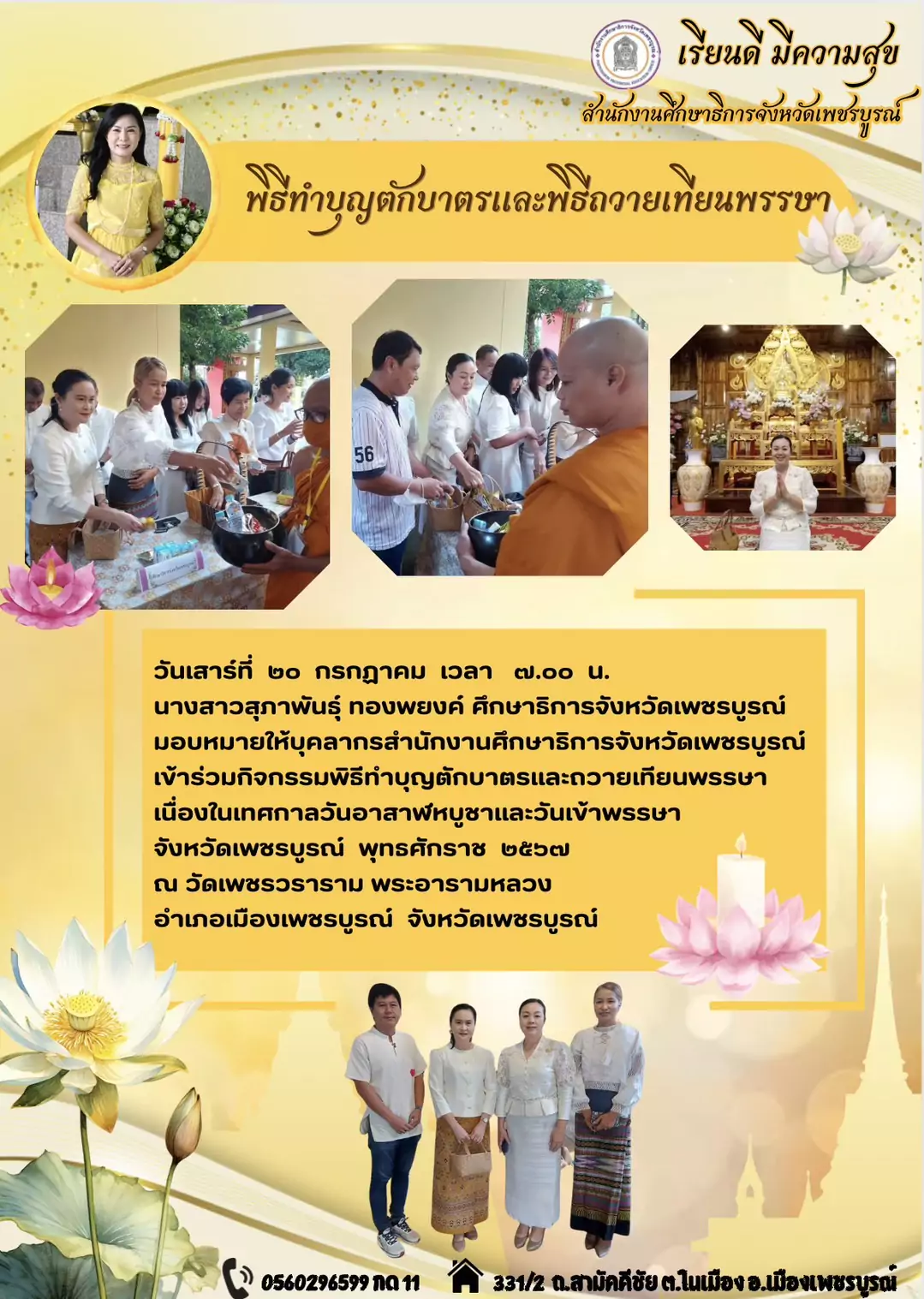 วันเสาร์ที่ 20 กรกฎาคม 2567 เวลา 07.00 น. นางสาวสุภาพันธุ์ ทองพยงค์ ศึกษาธิการจังหวัดเพชรบูรณ์ มอบหมายให้ นางสาวพัชรี อ่อนอิงนอน ผู้อำนวยการกลุ่มพัฒนาการศึกษา และคณะบุคลากร ร่วม“กิจกรรมพิธีทำบุญตักบาตรและถวายเทียนพรรษา เนื่องในเทศกาลวันอาสาฬหบูชาและวันเข้าพรรษา จังหวัดเพชรบูรณ์ ประจำปี 2567” ณ วัดเพชรวราราม พระอารามหลวง อำเภอเมืองเพชรบูรณ์ จังหวัดเพชรบูรณ์