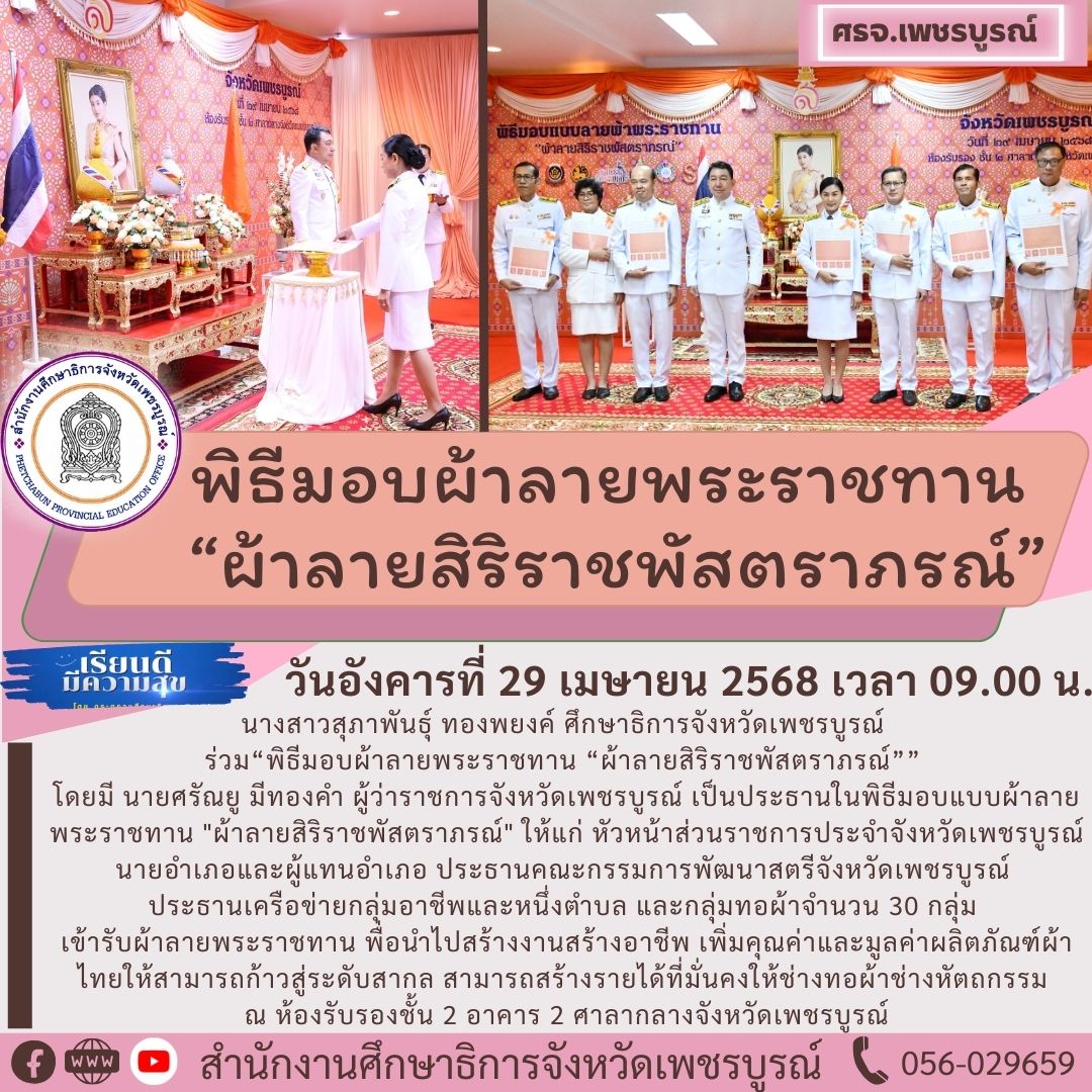 วันอังคารที่ 29 เมษายน 2568 เวลา 09.00 น. นางสาวสุภาพันธุ์ ทองพยงค์ ศึกษาธิการจังหวัดเพชรบูรณ์ ร่วม“พิธีมอบผ้าลายพระราชทาน “ผ้าลายสิริราชพัสตราภรณ์”” โดยมี นายศรัณยู มีทองคำ ผู้ว่าราชการจังหวัดเพชรบูรณ์ เป็นประธานในพิธีมอบแบบผ้าลายพระราชทาน “ผ้าลายสิริราชพัสตราภรณ์” ให้แก่ หัวหน้าส่วนราชการประจำจังหวัดเพชรบูรณ์ นายอำเภอและผู้แทนอำเภอ ในจังหวัดเพชรบูรณ์ ประธานคณะกรรมการพัฒนาสตรีจังหวัดเพชรบูรณ์ หัวหน้าคณะขับเคลื่อนกองทุนพัฒนาบทบาทสตรีจังหวัดเพชรบูรณ์ ประธานเครือข่ายกลุ่มอาชีพและหนึ่งตำบล หนึ่งผลิตภัณฑ์จังหวัดเพชรบูรณ์ ประธานสภาวัฒนธรรมจังหวัดเพชรบูรณ์ กลุ่มทอผ้าจำนวน 30 กลุ่ม เข้ารับผ้าลายพระราชทาน หน้าพระฉายาลักษณ์สมเด็จพระเจ้าลูกเธอ เจ้าฟ้าสิริวัณณวรี นารีรัตนราชกัญญา เพื่อนำไปสร้างงานสร้างอาชีพ เพิ่มคุณค่า และมูลค่าผลิตภัณฑ์ผ้าไทยให้สามารถก้าวสู่ระดับสากล สามารถสร้างรายได้ที่มั่นคง ให้ช่างทอผ้า ช่างหัตถกรรม ผู้ผลิต ผู้ประกอบการมีคุณภาพชีวิต ที่ดีขึ้น ณ ห้องรับรองชั้น 2 อาคาร 2 ศาลากลางจังหวัดเพชรบูรณ์