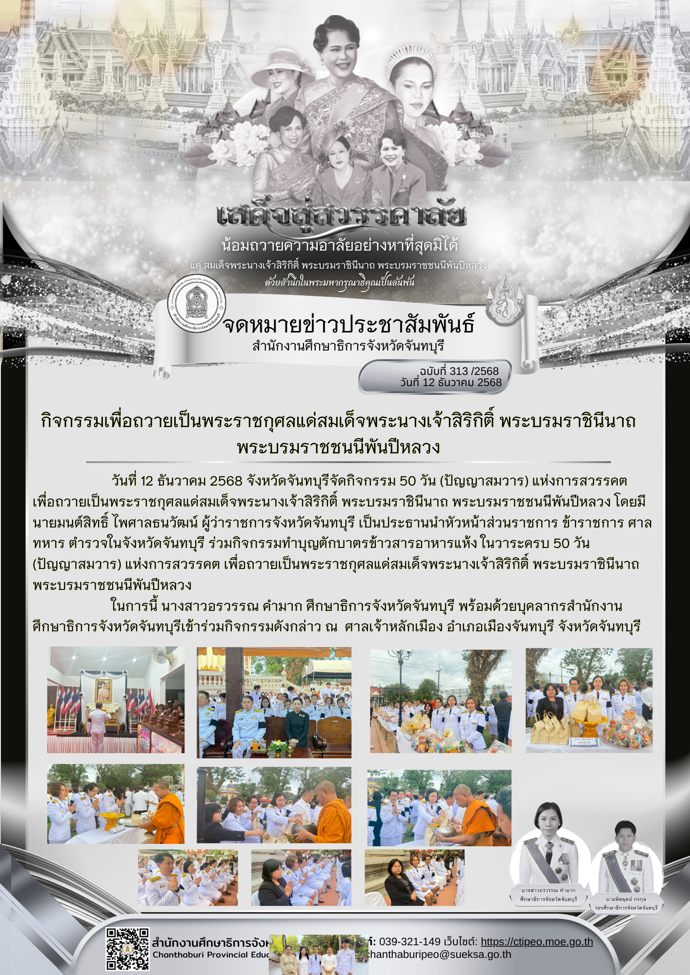 วันศุกร์ที่ 12 ธันวาคม 2568 เวลา 07.30 น. นางสาวสุภาพันธุ์ ทองพยงค์ ศึกษาธิการจังหวัดเพชรบูรณ์ พร้อมด้วย นางขวัญนภา จันทร์ดี รองศึกษาธิการจังหวัดเพชรบูรณ์  ข้าราชการ บุคลากร ร่วม“พิธีบำเพ็ญพระราชกุศลปัญญาสมวาร (วาระครบ 50 วัน) เพื่อถวายเป็นพระราชกุศลแด่ สมเด็จพระนางเจ้าสิริกิติ์ พระบรมราชินีนาถ พระบรมราชชนนีพันปีหลวง ภายหลังการสวรรคต” โดยมี นายศรัณยู มีทองคำ ผู้ว่าราชการจังหวัดเพชรบูรณ์ เป็นประธานในพิธี โดย พระเทพพัชรบัณฑิต เจ้าคณะภาค 4-5 (ธรรมยุต) เจ้าอาวาสวัดสนธิกรประชาราม เป็นประธานฝ่ายสงฆ์ พร้อมด้วย รองผู้ว่าราชการจังหวัดเพชรบูรณ์ หัวหน้าส่วนราชการ ข้าราชการ หน่วยงานทางการศึกษา สถานศึกษา เจ้าหน้าที่หน่วยงานต่าง ๆ และประชาชนทุกหมู่เหล่า ร่วมพิธีโดยพร้อมเพรียง ณ วัดเพชรวราราม พระอารามหลวง อำเภอเมืองเพชรบูรณ์