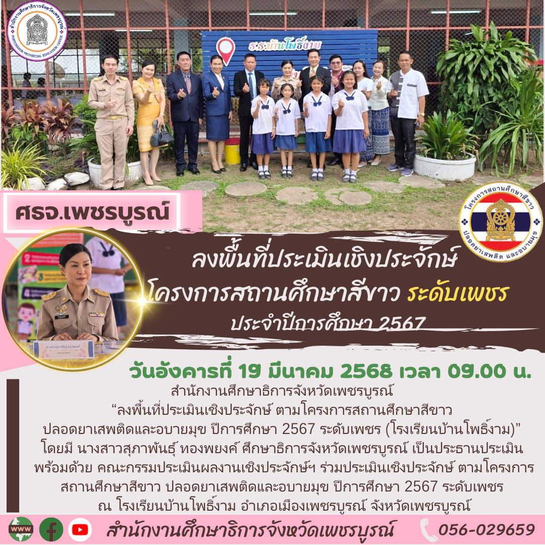 วันอังคารที่ 18 มีนาคม 2568 เวลา 09.00 น. สำนักงานศึกษาธิการจังหวัดเพชรบูรณ์ ดำเนินการ“ลงพื้นที่ประเมินเชิงประจักษ์ ตามโครงการสถานศึกษาสีขาว ปลอดยาเสพติดและอบายมุข ปีการศึกษา 2567 ระดับเพชร (โรงเรียนบ้านโพธิ์งาม)” โดยมี นางสาวสุภาพันธ์ุ ทองพยงค์ ศึกษาธิการจังหวัดเพชรบูรณ์ เป็นประธานประเมิน พร้อมด้วย คณะกรรมประเมินผลงานเชิงประจักษ์ฯ ร่วมประเมินเชิงประจักษ์ ตามโครงการสถานศึกษาสีขาว ปลอดยาเสพติดและอบายมุข ปีการศึกษา 2567 ระดับเพชร ณ โรงเรียนบ้านโพธิ์งาม อำเภอเมืองเพชรบูรณ์ จังหวัดเพชรบูรณ์