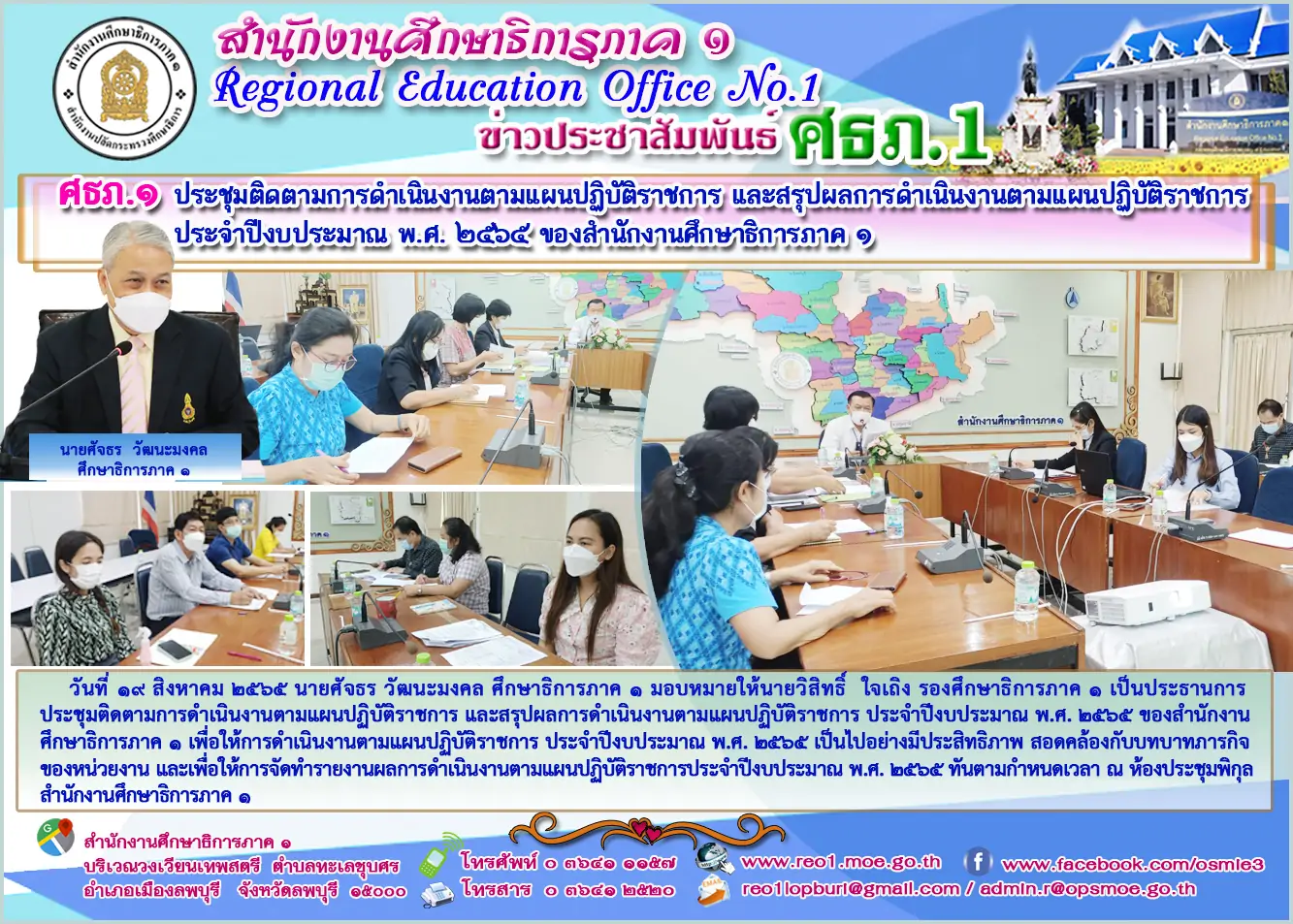 วันที่ ๑๙ สิงหาคม ๒๕๖๕ นายศัจธร วัฒนะมงคล ศึกษาธิการภาค ๑ มอบหมายให้นายวิสิทธิ์ ใจเถิง รองศึกษาธิการภาค ๑ เป็นประธานการประชุมติดตามการดำเนินงานตามแผนปฏิบัติราชการ และสรุปผลการดำเนินงานตามแผนปฏิบัติราชการ ประจำปีงบประมาณ พ.ศ. ๒๕๖๕ ของสำนักงานศึกษาธิการภาค ๑ เพื่อให้การดำเนินงานตามแผนปฏิบัติราชการ ประจำปีงบประมาณ พ.ศ. ๒๕๖๕ เป็นไปอย่างมีประสิทธิภาพ สอดคล้องกับบทบาทภารกิจของหน่วยงาน และเพื่อให้การจัดทำรายงานผลการดำเนินงานตามแผนปฏิบัติราชการประจำปีงบประมาณ พ.ศ. ๒๕๖๕ ทันตามกำหนดเวลา ณ ห้องประชุมพิกุล สำนักงานศึกษาธิการภาค ๑