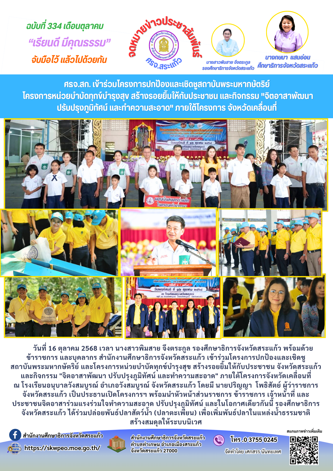 16 ต.ค. 68 (ศธจ.สระแก้ว) เข้าร่วมโครงการปกป้องและเชิดชูสถาบันพระมหากษัตริย์ และโครงการหน่วยบำบัดทุกข์บำรุงสุข สร้างรอยยิ้มให้กับประชาชน จังหวัดสระแก้ว และกิจกรรม “จิตอาสาพัฒนา ปรับปรุงภูมิทัศน์ และทำความสะอาด” ภายใต้โครงการจังหวัดเคลื่อนที่