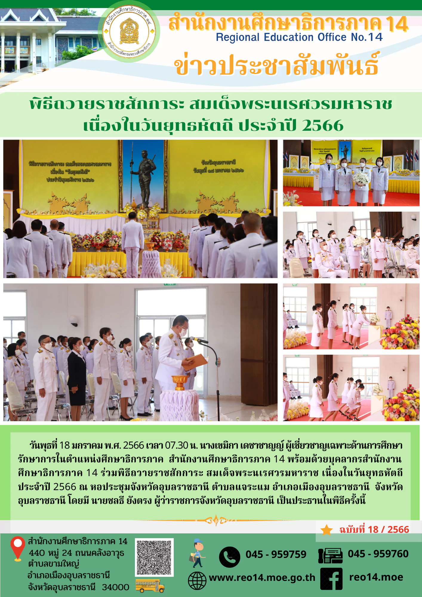 วันพุธที่ 18 มกราคม พ.ศ. 2566 เวลา 07.30 น. นางเขมิกา เดชาชาญญ์ ผู้เชี่ยวชาญเฉพาะด้านการศึกษา รักษาการในตำแหน่งศึกษาธิการภาค สำนักงานศึกษาธิการภาค 14 พร้อมด้วยบุคลากรสำนักงานศึกษาธิการภาค 14 ร่วมพิธีถวายราชสักการะ สมเด็จพระนเรศวรมหาราช เนื่องในวันยุทธหัตถีประจำปี 2566 ณ หอประชุมจังหวัดอุบลราชธานี ตำบลแจระแม อำเภอเมืองอุบลราชธานี จังหวัดอุบลราชธานี โดยมี นายชลธี ยังตรง ผู้ว่าราชการจังหวัดอุบลราชธานี เป็นประธานในพิธีครั้งนี้