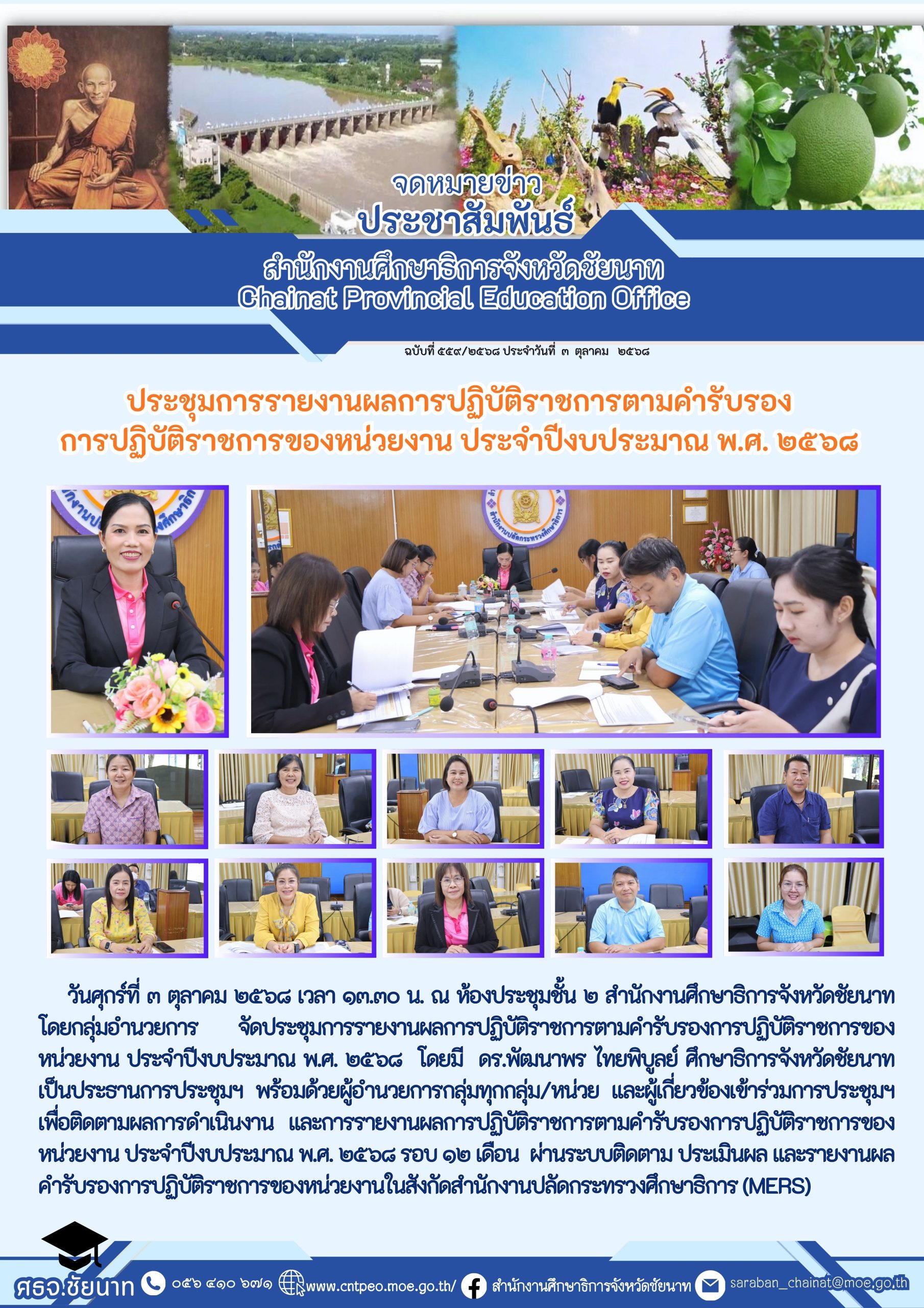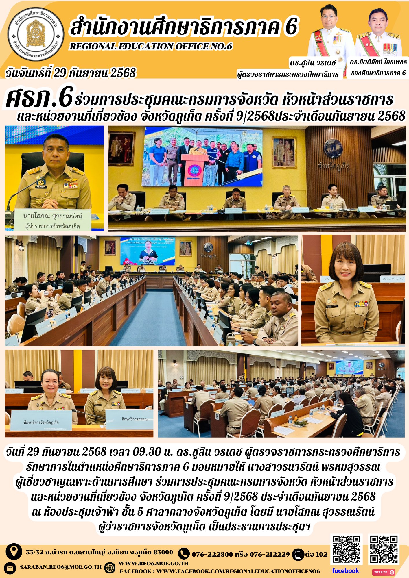 วันที่ 29 กันยายน 2568 เวลา 09.30 น. ดร.ชูสิน วรเดช ผู้ตรวจราชการกระทรวงศึกษาธิการ รักษาการในตำแหน่งศึกษาธิการภาค 6 มอบหมายให้ นางสาวธนารัตน์ พรหมสุวรรณ ผู้เชี่ยวชาญเฉพาะด้านการศึกษา ร่วมการประชุมคณะกรมการจังหวัด หัวหน้าส่วนราชการ และหน่วยงานที่เกี่ยวข้อง จังหวัดภูเก็ต ครั้งที่ 9/2568 ประจำเดือนกันยายน 2568 ณ ห้องประชุมเจ้าฟ้า ชั้น 5 ศาลากลางจังหวัดภูเก็ต โดยมี นายโสภณ สุวรรณรัตน์ ผู้ว่าราชการจังหวัดภูเก็ต เป็นประธานการประชุมฯ