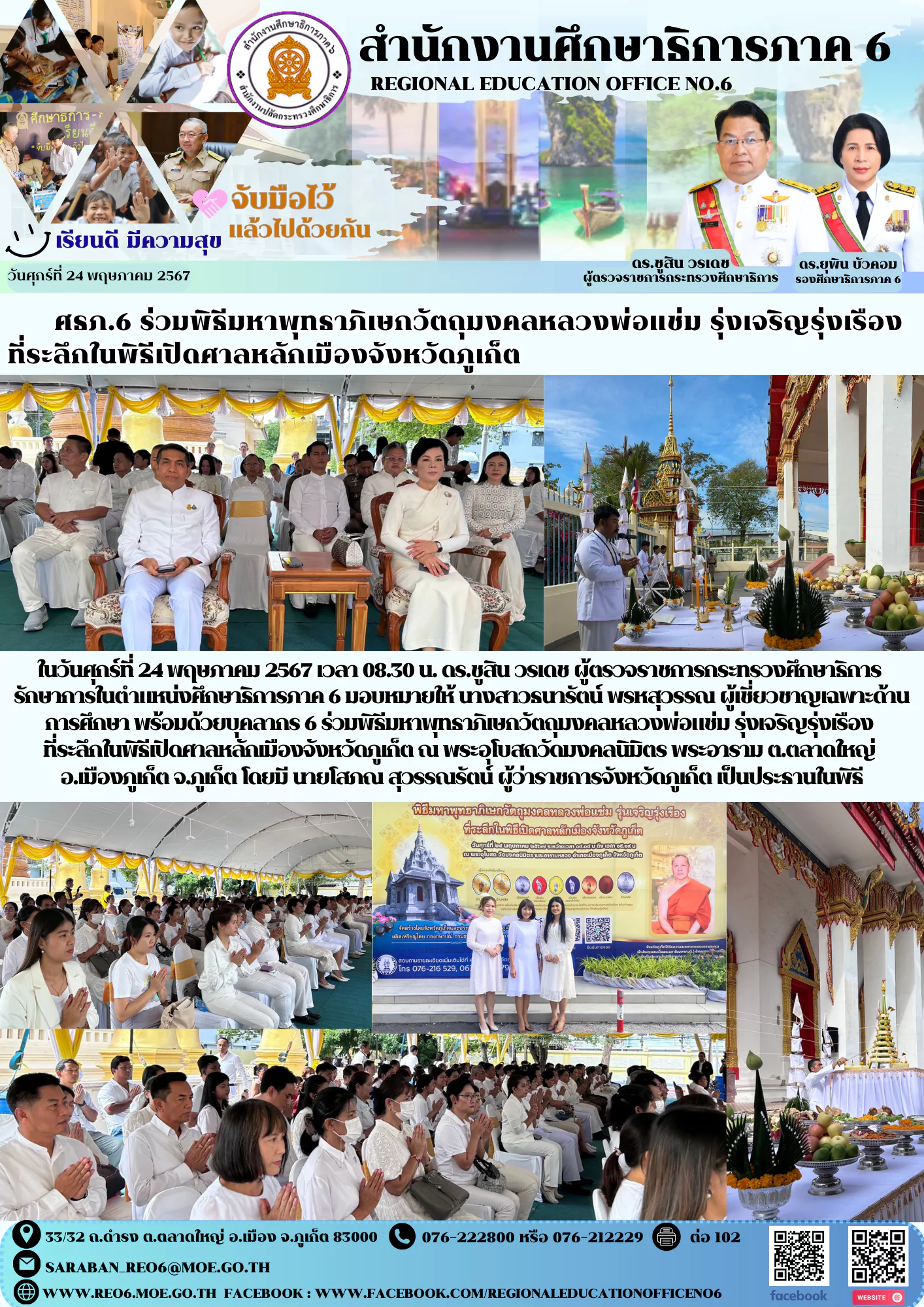 ในวันศุกร์ที่ 24 พฤษภาคม 2567 เวลา 08.30 น. ดร.ชูสิน วรเดช ผู้ตรวจราชการกระทรวงศึกษาธิการ รักษาการในตำแหน่งศึกษาธิการภาค 6 มอบหมายให้ นางสาวธนารัตน์ พรหมสุวรรณ ผู้เชี่ยวชาญเฉพาะด้านการศึกษา พร้อมด้วยบุคลากร 6 ร่วมพิธีมหาพุทธาภิเษกวัตถุมงคลหลวงพ่อแช่ม รุ่งเจริญรุ่งเรือง ที่ระลึกในพิธีเปิดศาลหลักเมืองจังหวัดภูเก็ต ณ พระอุโบสถวัดมงคลนิมิตร พระอาราม ตำบลตลาดใหญ่ อำเภอเมืองภูเก็ต จังหวัดภูเก็ต โดยมี นายโสภณ สุวรรณรัตน์ ผู้ว่าราชการจังหวัดภูเก็ต เป็นประธานในพิธี