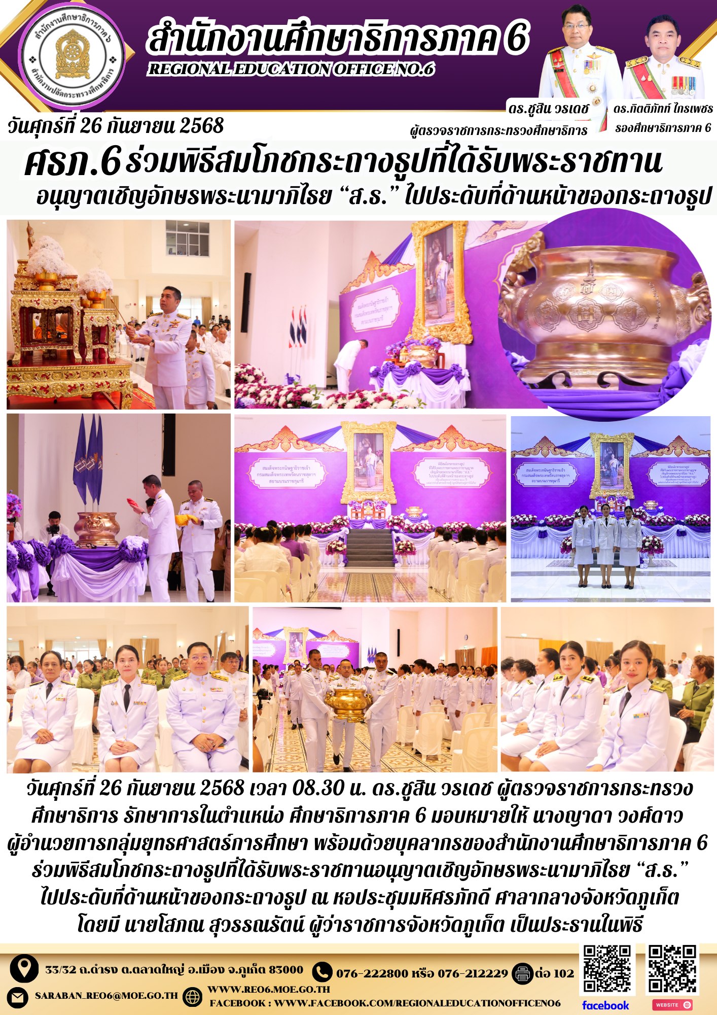 วันศุกร์ที่ 26 กันยายน 2568 เวลา 08.30 น. ดร.ชูสิน วรเดช ผู้ตรวจราชการกระทรวงศึกษาธิการ รักษาการในตำแหน่ง ศึกษาธิการภาค 6 มอบหมายให้ นางญาดา วงศ์ดาว ผู้อำนวยการกลุ่มยุทธศาสตร์การศึกษา พร้อมด้วยบุคลากรของสำนักงานศึกษาธิการภาค 6 ร่วมพิธีสมโภชกระถางธูปที่ได้รับพระราชทานอนุญาตเชิญอักษรพระนามาภิไธย “ส.ธ.” ไปประดับที่ด้านหน้าของกระถางธูป ณ หอประชุมมหิศรภักดี ศาลากลางจังหวัดภูเก็ต โดยมี นายโสภณ สุวรรณรัตน์ ผู้ว่าราชการจังหวัดภูเก็ต เป็นประธานในพิธี