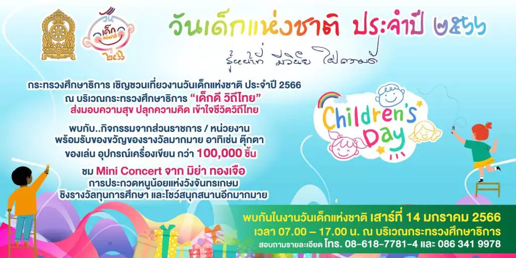 น.ส.ตรีนุช เทียนทอง รมว.ศึกษาธิการ กล่าวว่า การจัดงานวันเด็กแห่งชาติ ปี 2566 กระทรวงศึกษาธิการ (ศธ.) จัดขึ้นในวันเสาร์ที่ 14 ม.ค.นี้ ภายใต้แนวคิด “Children’s Day เด็กดี วิถีไทย” เพื่อส่งต่อความสุขควบคู่กับการเปิดประสบการณ์ใหม่ให้เด็ก ๆ ได้เรียนรู้ และลงมือปฏิบัติผ่านกิจกรรมที่เสริมสร้างเด็กและเยาวชนให้เป็นพลเมืองที่ดี พร้อมเรียนรู้วิถีไทยด้วยความสุข ความสนุกแบบเต็มอิ่ม ตามคำขวัญวันเด็กประจำปี 2566 คือ “รู้หน้าที่ มีวินัย ใฝ่ความดี” ที่นายกรัฐมนตรีได้มอบให้