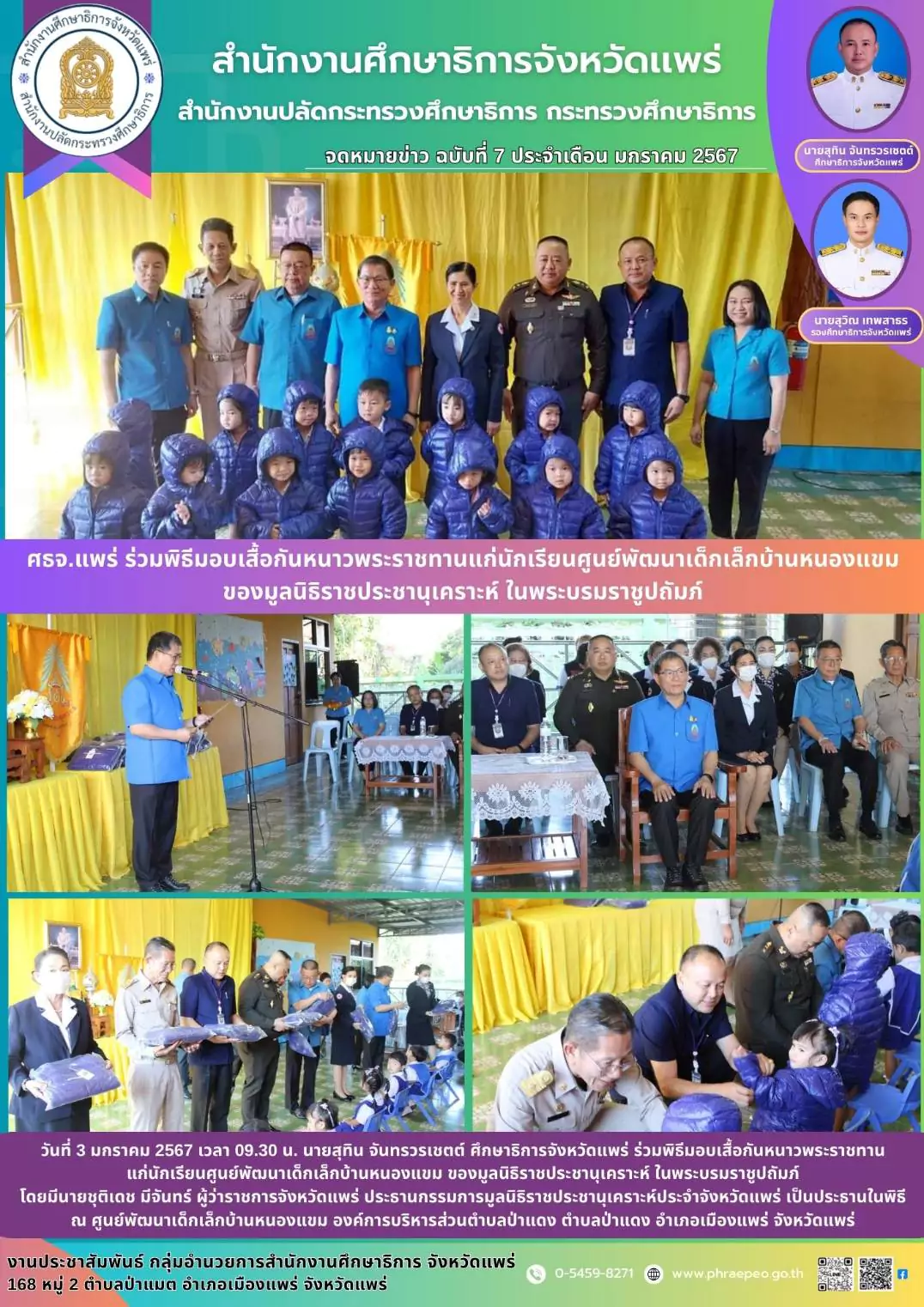 04 ม.ค. 67 ศธจ.แพร่ ร่วมพิธีมอบเสื้อกันหนาวพระราชทานแก่นักเรียนศูนย์พัฒนาเด็กเล็กบ้านหนองแขม ของมูลนิธิราชประชานุเคราะห์ ในพระบรมราชูปถัมภ์