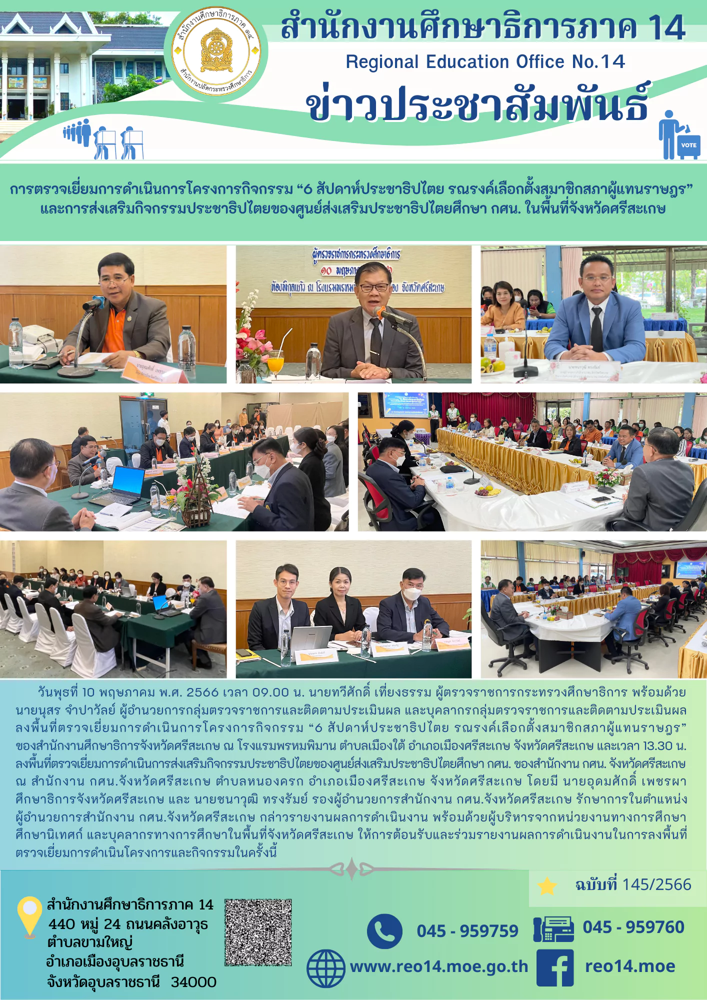 10 พ.ค. 66 ศธภ.14 ตรวจเยี่ยมการดำเนินการโครงการกิจกรรม “6 สัปดาห์ประชาธิปไตย รณรงค์เลือกตั้งสมาชิกสภาผู้แทนราษฎร” และการส่งเสริมกิจกรรมประชาธิปไตยของศูนย์ส่งเสริมประชาธิปไตยศึกษา กศน. ในพื้นที่จังหวัดศรีสะเกษ