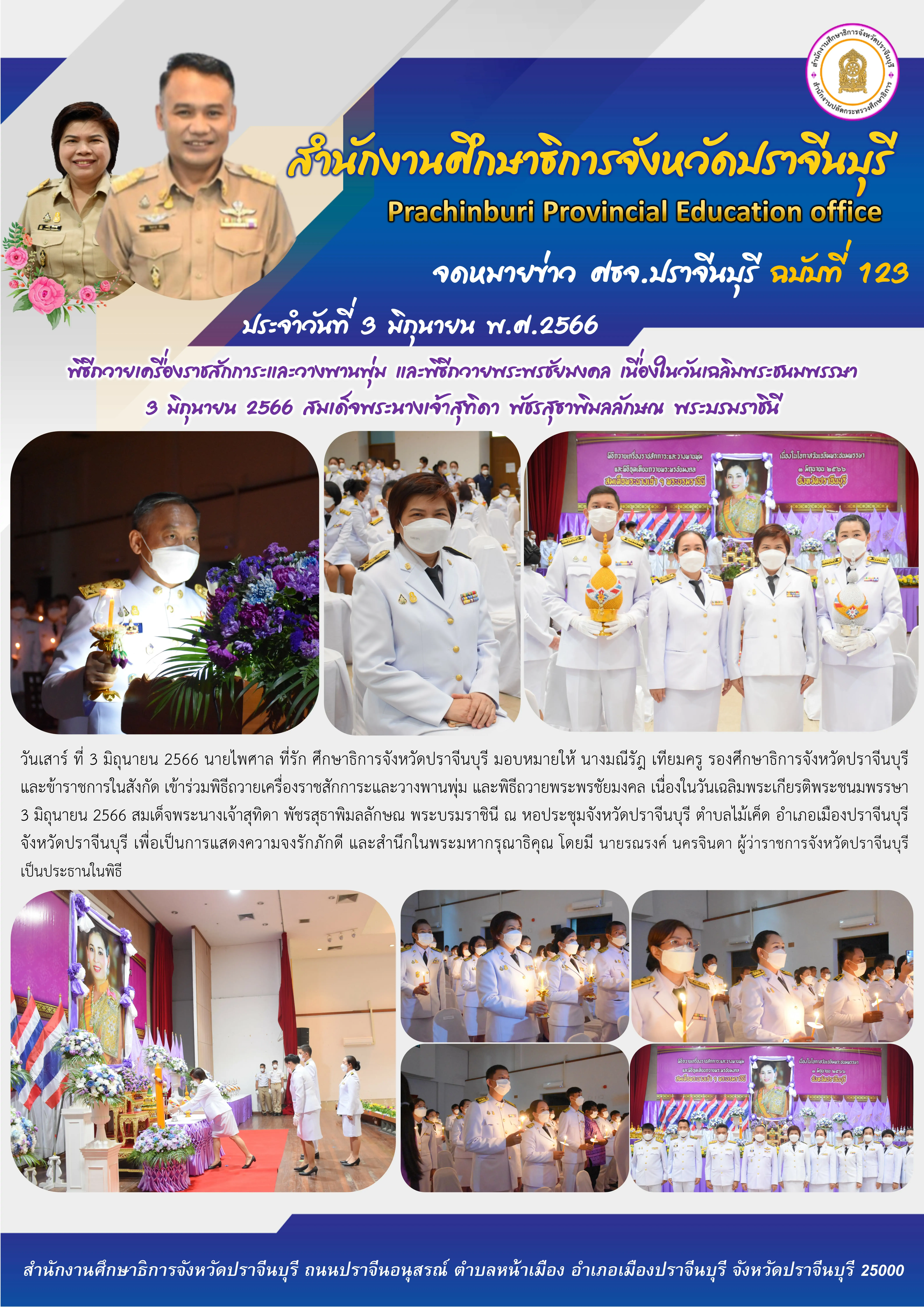 03 มิ.ย. 66 ศธจ.ปราจีนบุรี เข้าร่วมพิธีถวายเครื่องราชสักการะและวางพานพุ่ม และพิธีถวายพระพรชัยมงคล เนื่องในวันเฉลิมพระชนมพรรษา 3 มิถุนายน 2566 สมเด็จพระนางเจ้าสุทิดา พัชรสุธาพิมลลักษณ พระบรมราชินี