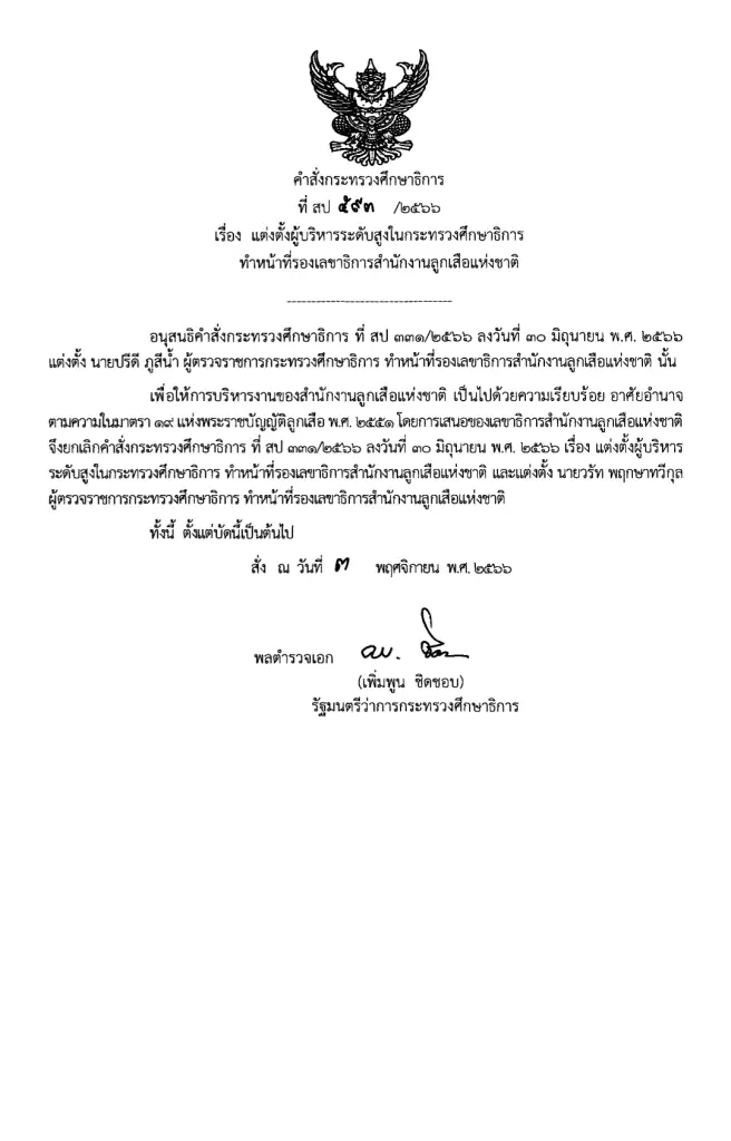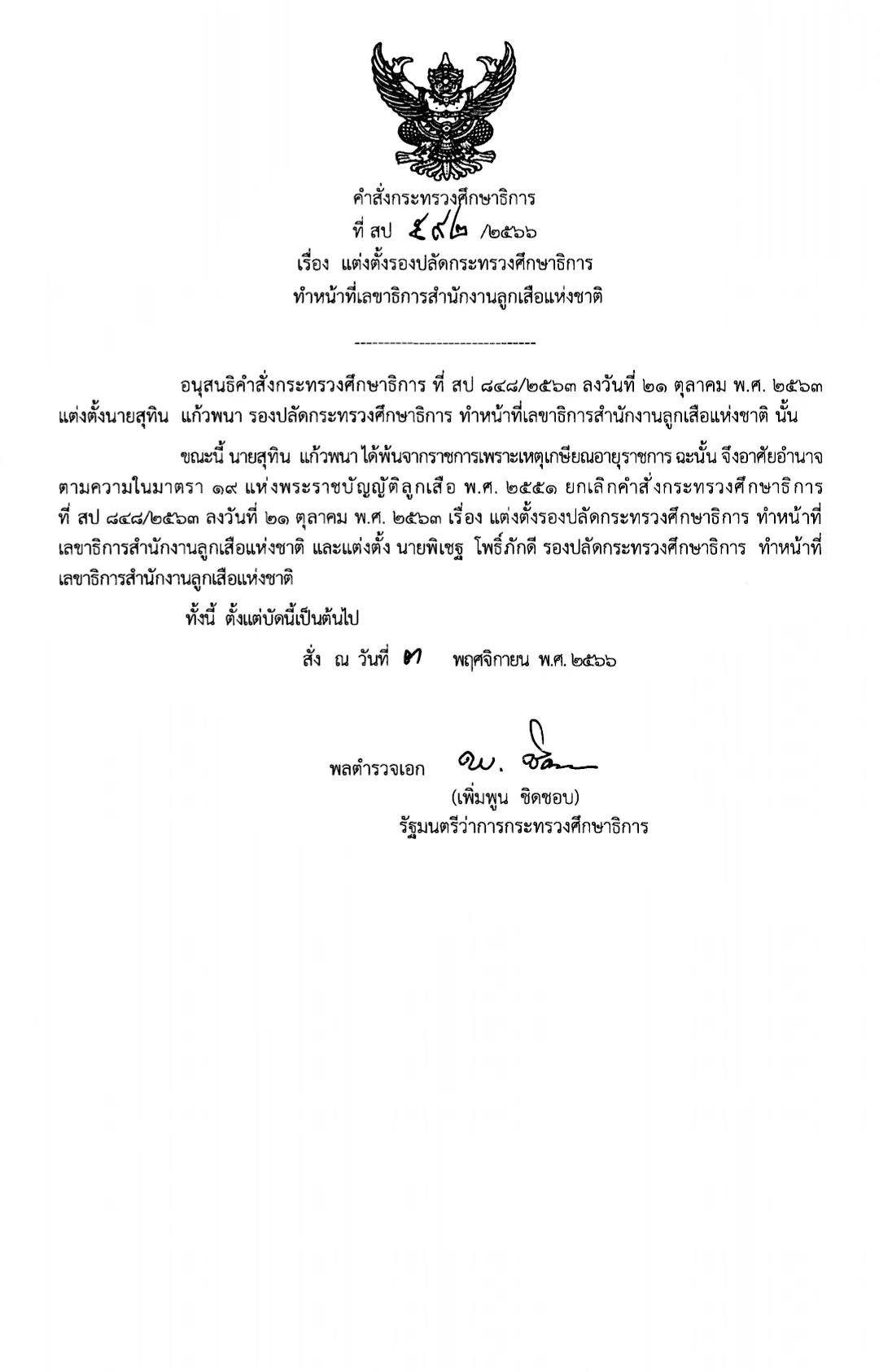 เมื่อวันที่ 3 พฤศจิกายน 2566 พลตำรวจเอก เพิ่มพูน ชิดชอบ รัฐมนตรีว่าการกระทรวงศึกษาธิการ ลงนามในคำสั่งกระทรวงศึกษาธิการ แต่งตั้ง