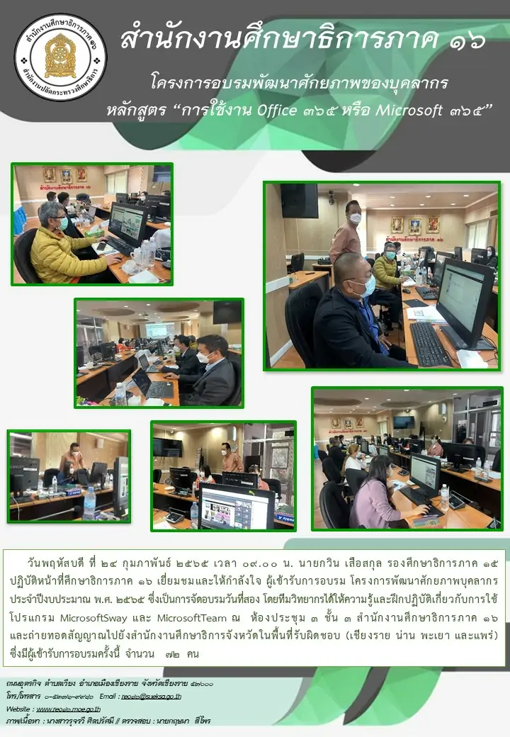 วันพฤหัสบดี ที่ 24 กุมภาพันธ์ 2565 เวลา 09.00 น. นายกวิน เสือสกุล รองศึกษาธิการภาค 15 ปฏิบัติหน้าที่ศึกษาธิการภาค 16 เยี่ยมชมและให้กำลังใจ ผู้เข้ารับการอบรม โครงการพัฒนาศักยภาพบุคลากรประจำปีงบประมาณ พ.ศ. 2565 ซึ่งเป็นการจัดอบรมวันที่สอง โดยทีมวิทยากรได้ให้ความรู้และฝึกปฏิบัติเกี่ยวกับการใช้โปรแกรม MicrosoftSway และ MicrosoftTeamณ ห้องประชุม 3 ชั้น 3 สำนักงานศึกษาธิการภาค 16 และถ่ายทอดสัญญาณไปยังสำนักงานศึกษาธิการจังหวัดในพื้นที่รับผิดชอบ (เชียงราย น่าน พะเยา และแพร่) ซึ่งมีผู้เข้ารับการอบรมครั้งนี้ จำนวน 72 คน