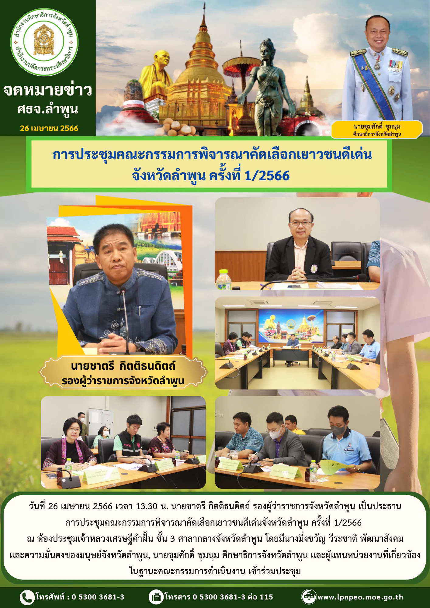 26 เม.ย. 66 ศธจ.ลำพูน เข้าร่วมการประชุมคณะกรรมการพิจารณาคัดเลือกเยาวชนดีเด่นจังหวัดลำพูน ครั้งที่ 1/2566