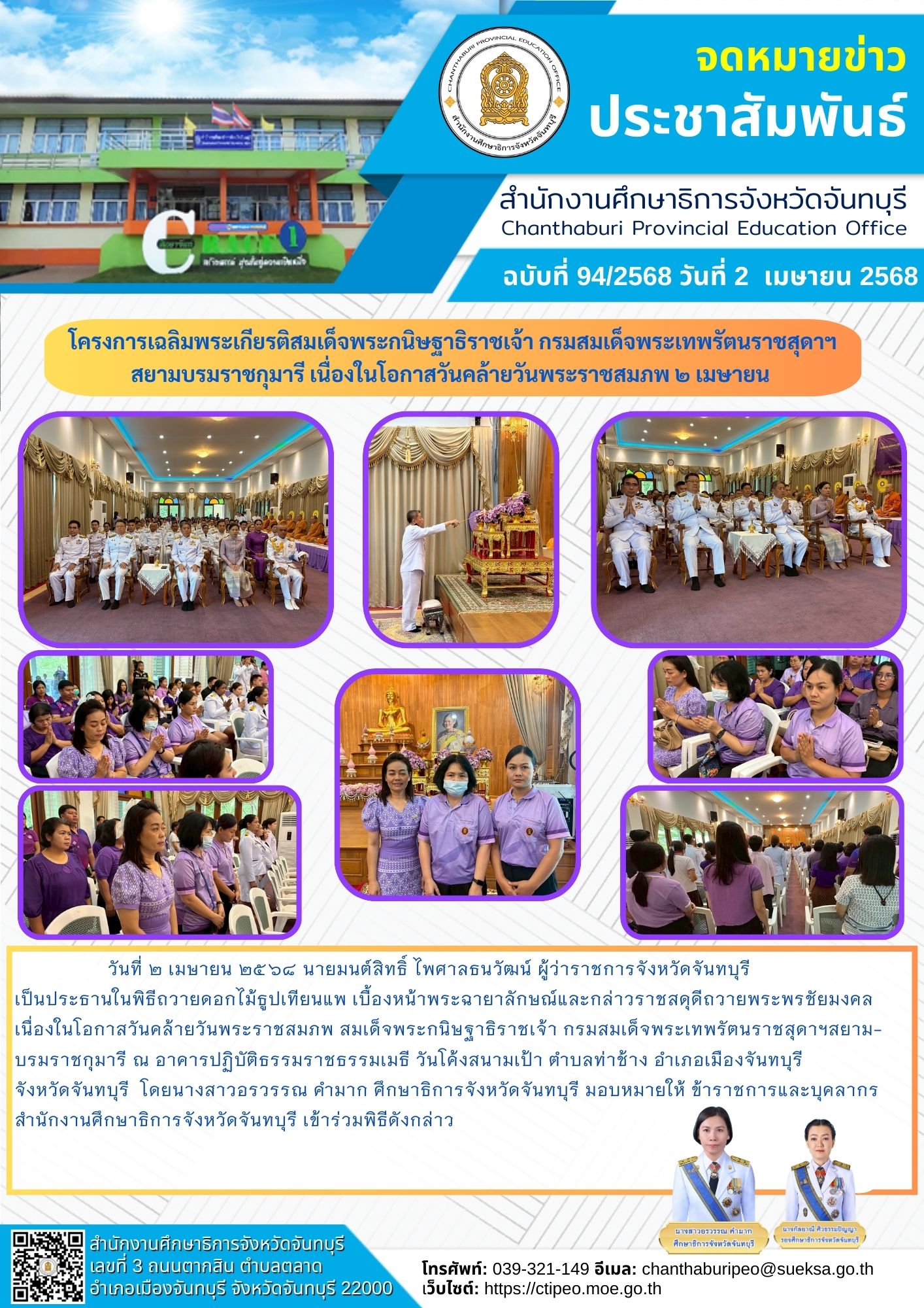 02 เม.ย. 68 (ศธจ.จันทบุรี) โครงการเฉลิมพระเกียรติสมเด็จพระกนิษฐาธิราชเจ้า กรมสมเด็จพระเทพรัตนราชสุดาฯ สยามบรมราชกุมารี เนื่องในโอกาสวันคล้ายวันพระราชสมภพ ๒ เมษายน