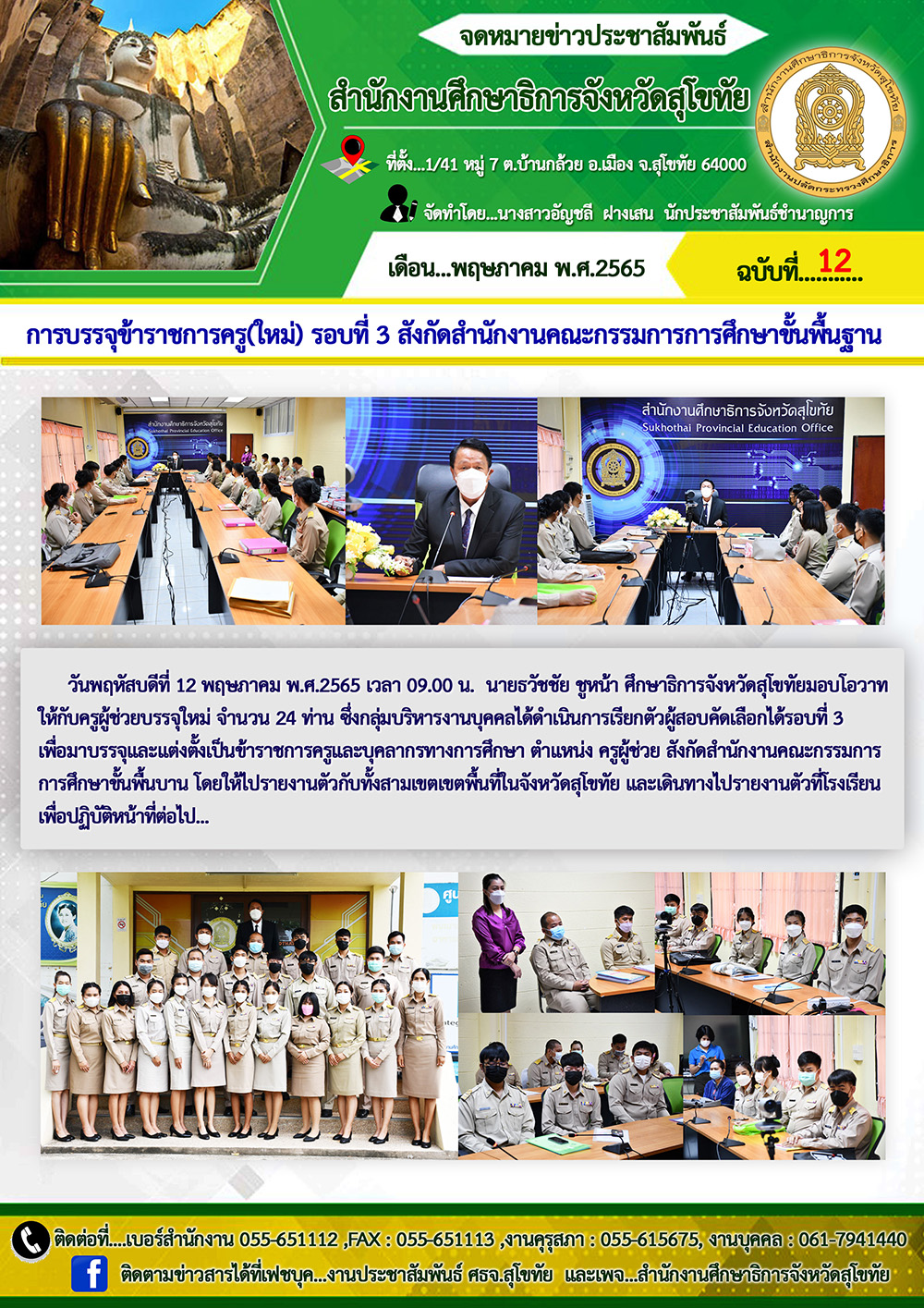 วันพฤหัสบดีที่ 12 พฤษภาคม พ.ศ.2565 เวลา 09.00 น. นายธวัชชัย ชูหน้า ศึกษาธิการจังหวัดสุโขทัยมอบโอวาทให้กับครูผู้ช่วยบรรจุใหม่ จำนวน 24 ท่าน ซึ่งกลุ่มบริหารงานบุคคลได้ดำเนินการเรียกตัวผู้สอบคัดเลือกได้รอบที่ 3 เพื่อมาบรรจุและแต่งตั้งเป็นข้าราชการครูและบุคลากรทางการศึกษา ตำแหน่ง ครูผู้ช่วย สังกัดสำนักงานคณะกรรมการการศึกษาขั้นพื้นบาน โดยให้ไปรายงานตัวกับทั้งสามเขตเขตพื้นที่ในจังหวัดสุโขทัย และเดินทางไปรายงานตัวที่โรงเรียนเพื่อปฏิบัติหน้าที่ต่อไป…