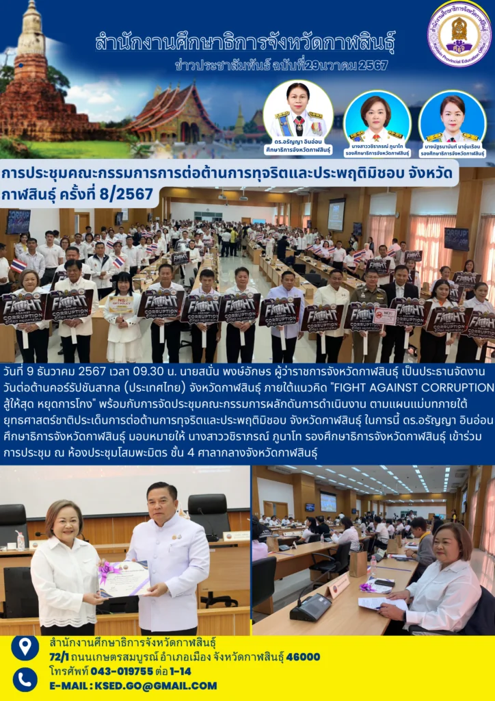 วันที่ 9 ธันวาคม 2567 เวลา 09.30 น. นายสนั่น พงษ์อักษร ผู้ว่าราชการจังหวัดกาฬสินธุ์ เป็นประธานจัดงานวันต่อต้านคอร์รัปชันสากล (ประเทศไทย) จังหวัดกาฬสินธุ์ ภายใต้แนวคิด “FIGHT AGAINST CORRUPTION สู้ให้สุด หยุดการโกง” พร้อมกับการจัดประชุมคณะกรรมการผลักดันการดำเนินงานตามแผนแม่บทภายใต้ยุทธศาสตร์ชาติประเด็นการต่อต้านการทุจริตและประพฤติมิชอบ จังหวัดกาฬสินธุ์ และรับชมการถ่ายทอดสดการประกาศเจตนารมณ์ เนื่องในวันต่อต้านคอร์รัปชันสากล (ประเทศไทย) ผ่าน Facebook Live สำนักงาน ป.ป.ช. ในการนี้ ดร.อรัญญา อินอ่อน ศึกษาธิการจังหวัดกาฬสินธุ์ มอบหมายให้ นางสาววชิราภรณ์ ภูนาโท รองศึกษาธิการจังหวัดกาฬสินธุ์ เข้าร่วมการประชุม ณ ห้องประชุมโสมพะมิตร ชั้น 4 ศาลากลางจังหวัดกาฬสินธุ์