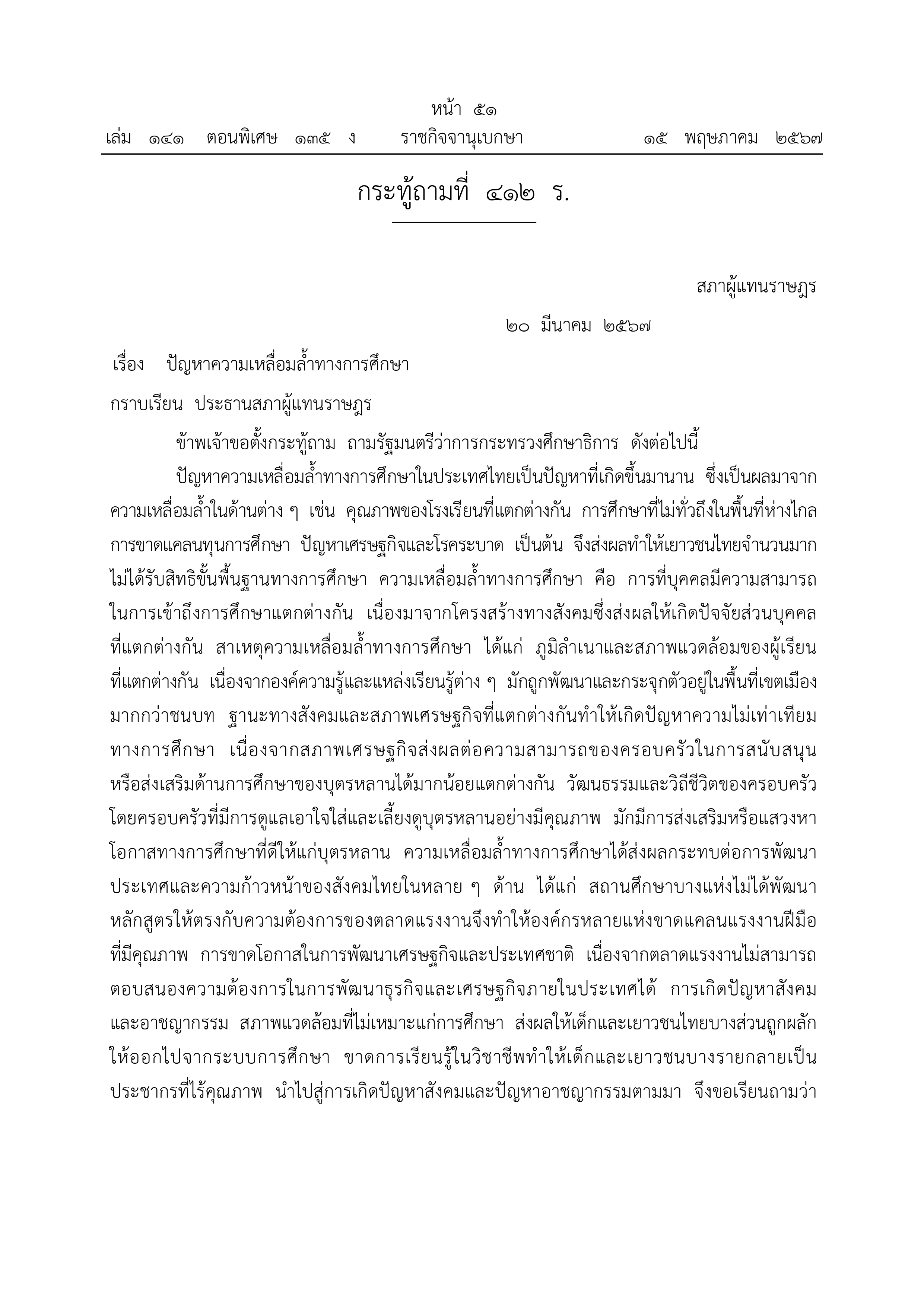 รมว.ศธ.ตอบกระทู้ถาม เรื่อง ปัญหาความเหลื่อมล้ำทางการศึกษา