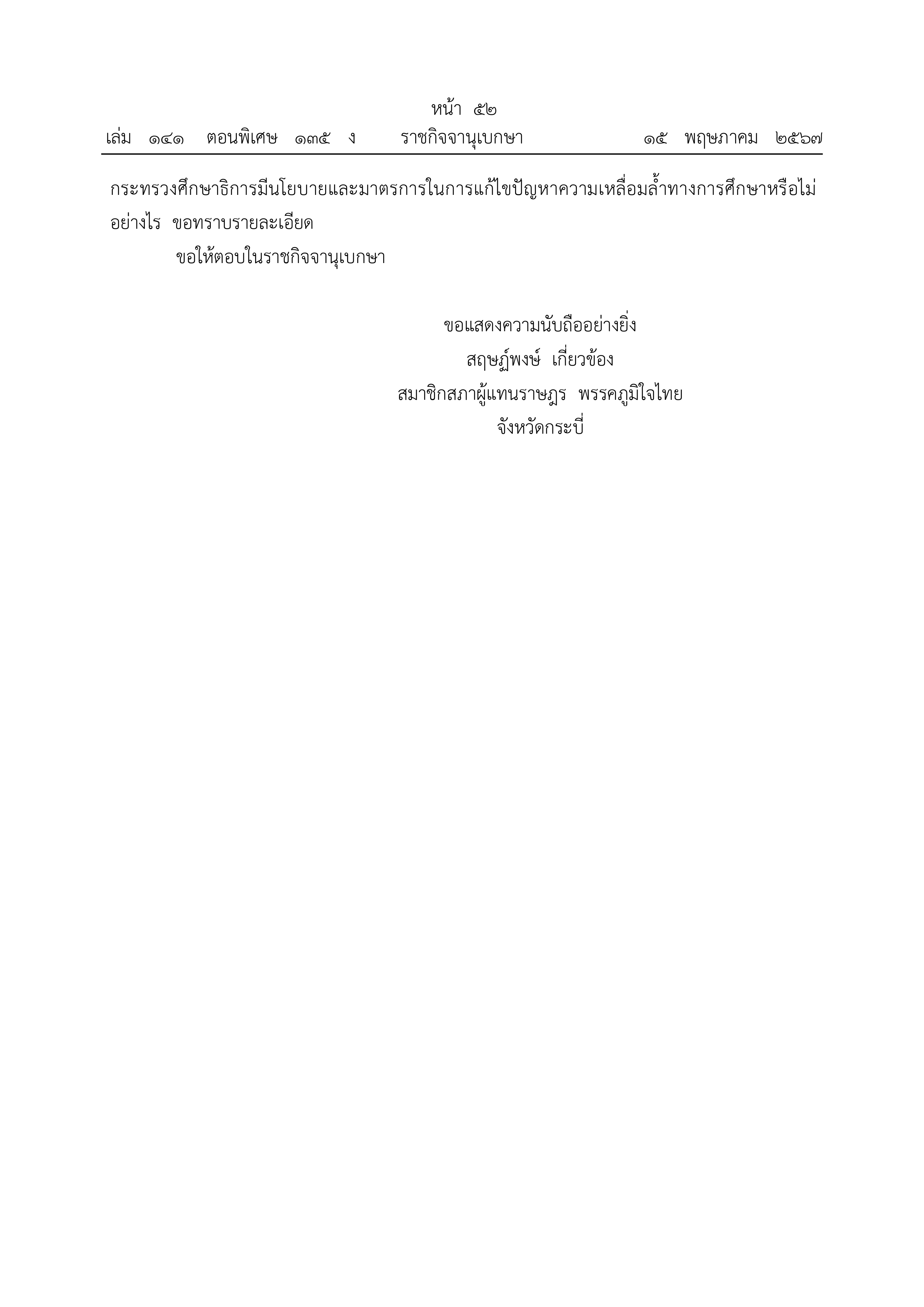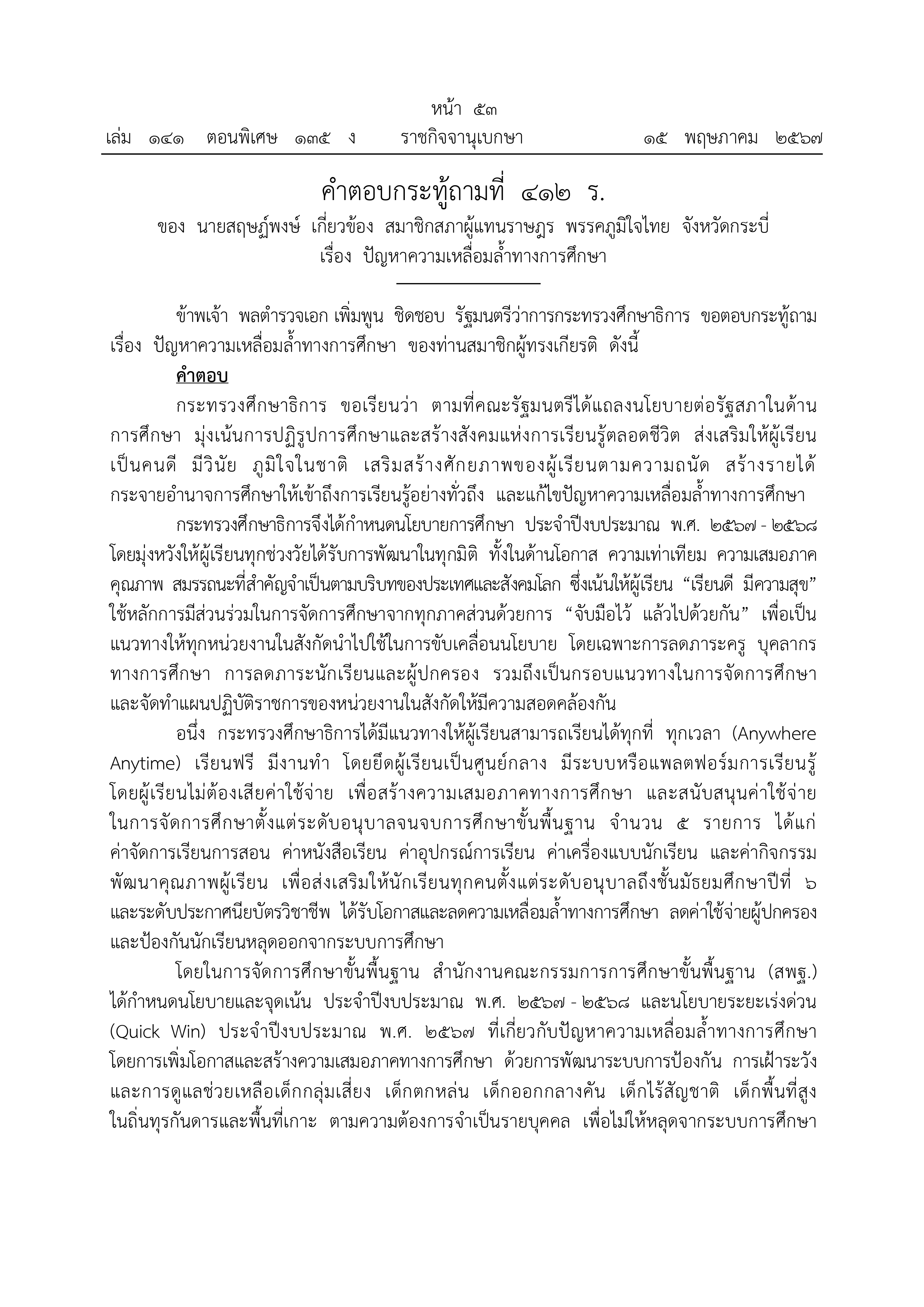 พลตำรวจเอก เพิ่มพูน ชิดชอบ รัฐมนตรีว่าการกระทรวงศึกษาธิการ ตอบกระทู้ถามของนายสฤษฏ์พงษ์ เกี่ยวข้อง สมาชิกสภาผู้แทนราษฎร พรรคภูมิใจไทย จังหวัดกระบี่ เรื่อง ปัญหาความเหลื่อมล้ำทางการศึกษา ในราชกิจจานุเบกษา (15 พฤษภาคม 2567)