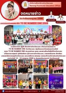 นางรัชดาภรณ์ ปฏิบัติ ศึกษาธิการจังหวัดระนอง เข้าร่วมนำเสนอผลงาน TO BE NUMBER ONE จังหวัดระนอง กลุ่มต้นแบบระดับเพชรและร่วมเชียร์ชมรม TO BE NUMBER ONE ประเภทอำเภอ ชุมชน และสถานศึกษาในพื้นที่จังหวัดระนอง นำโดยนายนายสุพจน์ ภูติเกียรติขจร ผู้ว่าราชการจังหวัดระนอง, นายแพทย์นรเทพ อัศวพัชระ นายแพทย์สาธารณสุขจังหวัดระนอง และนายสีหราช สรรพกุล นายกองค์การบริหารส่วนจังหวัดระนอง ระหว่างวันที่ 12 – 15 กรกฎาคม 2568 ณ อิมแพคเมืองทองธานี จังหวัดนนทบุรี