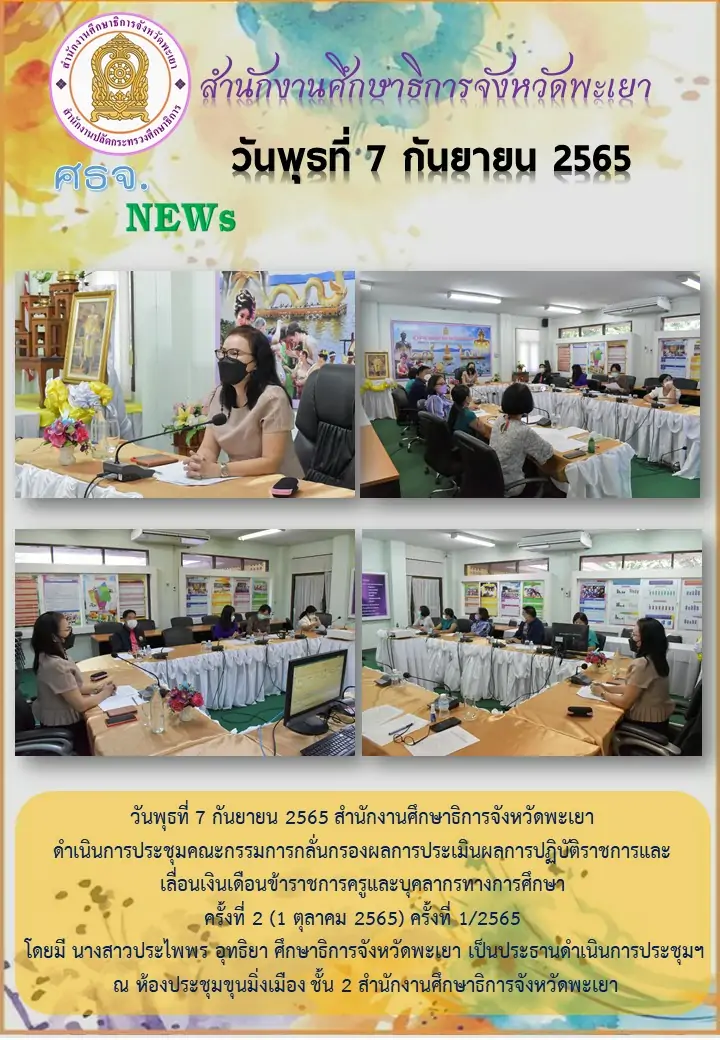 07 ก.ย. 65 ศธจ.พะเยา ดำเนินการประชุมคณะกรรมการกลั่นกรองผลการประเมินผลการปฏิบัติราชการและ เลื่อนเงินเดือนข้าราชการครูและบุคลากรทางการศึกษา ครั้งที่ 2 (1 ตุลาคม 2565) ครั้งที่ 1/2565